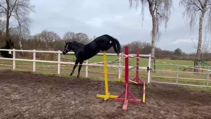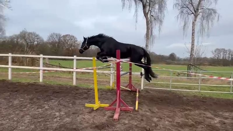 I purchased this mare myself just last year. Shortly thereafter, I found out I was expecting twins. This mare is so eager to learn that it would be a shame for her to stand around unused. She was originally intended to be my future competition horse, but unfortunately, I simply won't have the time to train her properly. She is worked on a daily basis. The mare is very affectionate and enjoys cuddling. She has such quick, agile front legs when jumping. It’s really a pity that I have to part with her, but she would feel more comfortable with a rider who actively works with her. I lunged her for three or four months to properly prepare her for riding. Afterwards, I sat on her (while pregnant). I always felt confident with her, otherwise I wouldn’t have done it. After the fourth ride, I felt the urge to go for a walk in the field at a walk. She is simply so well-behaved. There’s no need to longe her before riding. She has enough go and is not overly hot or spirited under saddle. We don’t have an indoor riding arena, and she has always been ridden outside next to a road. That doesn’t bother her. We have also been out on two trail rides. I can imagine someone who enjoys high-level show jumping but also rides dressage or eventing. I also see her fitting well with a young, ambitious rider because she is so calm and reliable. The mare is absolutely stunning. Just look at her and fall in love.