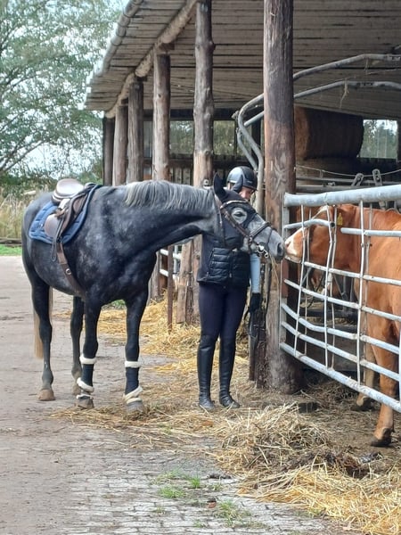Verkaufe wegen akuten Zeitmangel Talentierte 5 Jöhrige Stute Ca.164cm DIACONTINUS x Balou de Rouet xContinue Super unerschrocken und brav im Umgang Beim Reiten Temperamentvoll mit viel GO Springt kl. Parcour durch Zeitmangel da noch nicht weiter gefördert. War letztes Jahr auf einem Extrem Trail , das hat sie alles absolut brav ohne zu zögern gemacht ( Videos vorhanden) Da ich mit kleinen Kind leider wenig Zeit habe, verkaufe ich sie nicht voll im Training. Potenzial aufjedenfall vorhanden! Mutig genug auch für Vielseitigkeit. Nicht für Anfänger/ Wiedereinsteiger geeignet. Fürs Probereiten wird 40€ berechnet. Beim Kauf natürlich verrechnet.