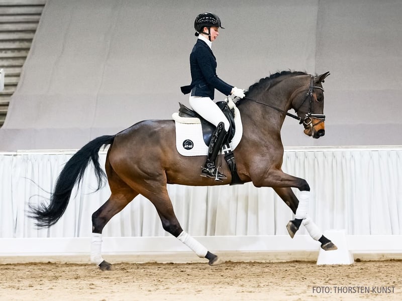 Goldstaub impresses under saddle with an appealing overall appearance, relaxation, and good basic gaits. She has all doors open for a successful future. Her maternal half-siblings have also already proven themselves in sport: Fandango HL by Franziskus (Dressage: M** with Karin Hesse) and Simply Red by Sir Heinrich (Dressage: M with Jennifer Mieves). 2nd Generation Sport Horses Dressage: Fandango HL by Franziskus (Dressage: M** with Karin Hesse). Advanced Dressage Tests: Simply Red 55 by Sir Heinrich (Dressage: M); Toffifee/Toffifee S.R. by Tesla (Dressage: L). 3rd Generation Advanced Dressage Tests: Buckingham's Best Boy by Buckingham (Dressage: L). 4th Generation Sport Horses Dressage: Eddison 3 by Ehrenpreis (Dressage: M* with Victoria Radspieler). Approved Stallions: Approved stallion Active Solaris by Sezuan (MS-Handorf 2018). 5th Generation Sport Horses Dressage: Raffael 31 by Rosenkavalier (Dressage: Grand Prix with Kröger-Rück, Ute; competed in Grand Prix, Grand Prix Special 2001/2002; multiple high-level dressage tests). Show Jumping Sport Horses: LS-S Monamira by Milan (S-Jumping: M with Vollmers, Ricarda). Advanced Dressage Tests: Ribalta Fortuna by Rosenkavalier (Dressage: L). Advanced Jumping Tests: Mad Man by Milan (Jumping: L). Mother: Fair Lady Foal number: 6/6 Performance record: Field test for riding horse – Trot 8.50, Canter 8.50, Walk 7.50 / Overall rideability 8.25 / Overall jumping 5.00 Competition successes: RPF: without class 1/3. Grandmother: Esther Foal number: 12/12 This horse is a Verden auction horse and will be sold online on January 25, 2026. From January 12 to January 25, the horse can be viewed and tested daily during public training sessions. The starting bid at the auction is €8,000.