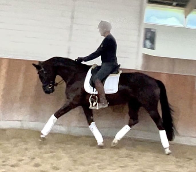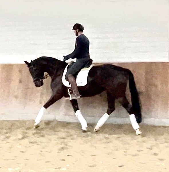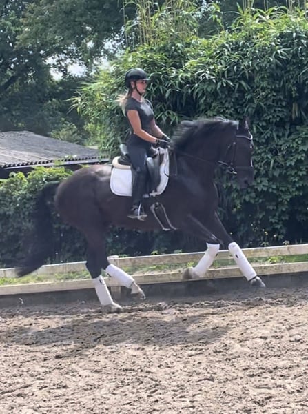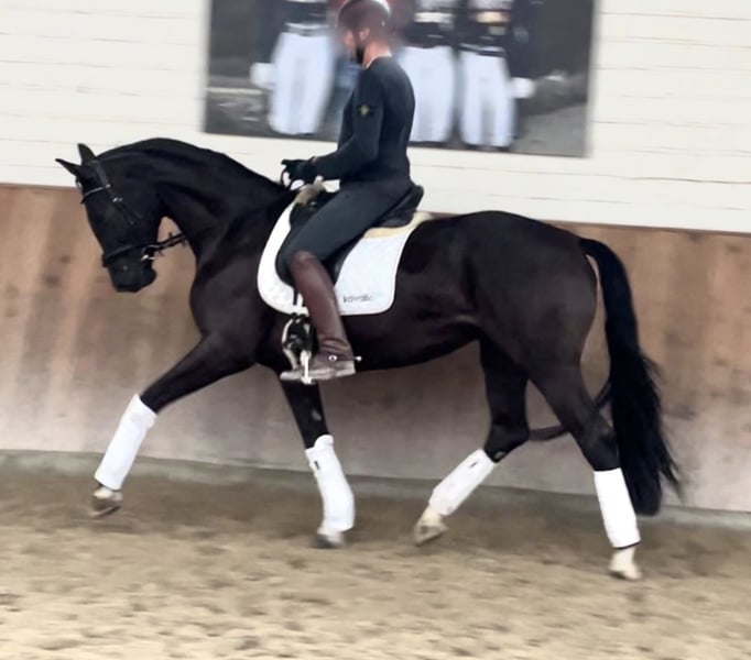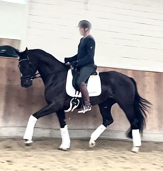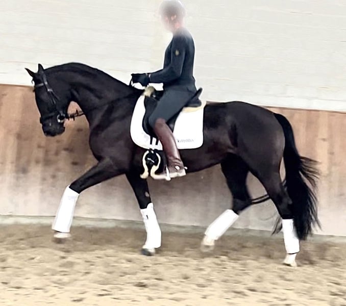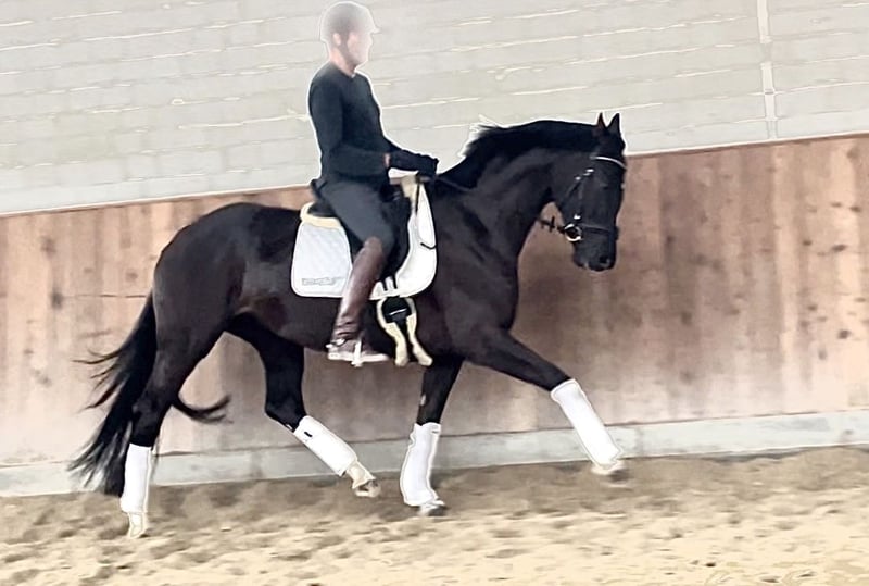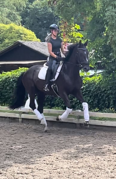Wunderschöne typvolle Rappstute aus 1. Hand in beste Hände zu verkaufen. Ein Pferd, welches durch die imposante Erscheinung überall auffällt. Sie befindet sich in einem der renommiertesten Ausbildungsställe in NRW und genießt hier die perfekte Ausbildung, die sich ein Pferd wünschen kann. Sie ist 4,5 Jahre alt, ca. 1,70 Mund befindet sich auf A Niveau. Sie ist draussen wie drinnen zu reiten und will immer alles richtig machen. Bocken und Steigen kennt sie absolut nicht. Mit anderen Pferden sehr umgänglich, auch auf der Weide. Vater Kjento ist Doppel-Weltmeister der 6- und 7-jährigen Dressurpferde (Ermelo 2021 & 2022). Kjento begeistert durch moderne Linienführung, bestechenden Typ sowie Grundgangarten auf Weltklasse-Niveau. Mittlerweile ist er international unter Charlotte Fry gesiegt. Ihre Mutter war selbst hocherfolgreich in S Dressuren platziert und stammt aus bester Linienführung. Ein guter Röntgentüv einschließlich Rücken liegt vor. Um dieses tolle Pferd zu schonen, wird eine Schutzgebühr für das Vorstellen/ Probereiten der Stute in Höhe von 50 Euro erhoben, die natürlich bei Kauf verrechnet werden. Standort: Krefeld / NRW Wegen Aufgabe des Reitsports: Preis: 27.500 E