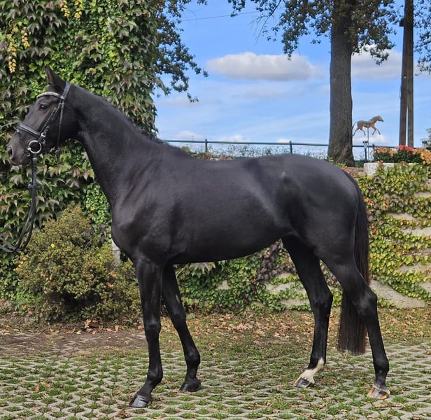 Modern, leggy black mare with three excellent basic gaits and outstanding rideability. She also possesses a truly friendly, people-oriented temperament. We are looking for a supportive and loving new home for this dream horse. A recent TÜV report without findings, including X-rays of the back, is available. In training for three months; the price will increase with further education. If interested, please contact us exclusively by phone or WhatsApp at 01744022800.