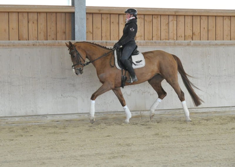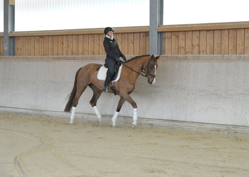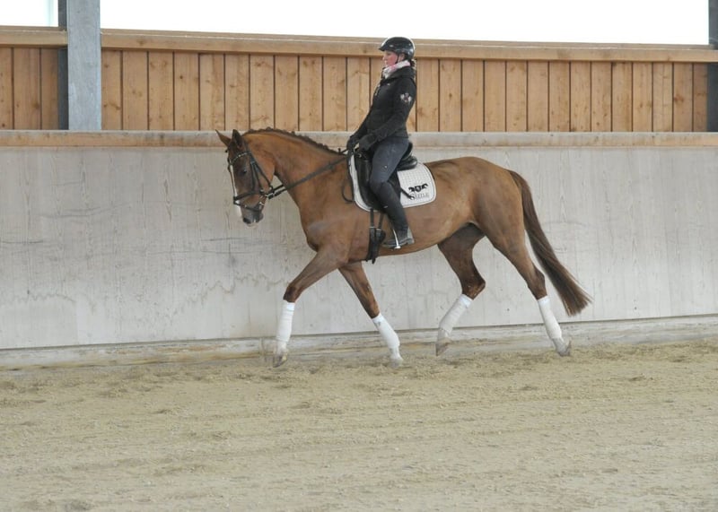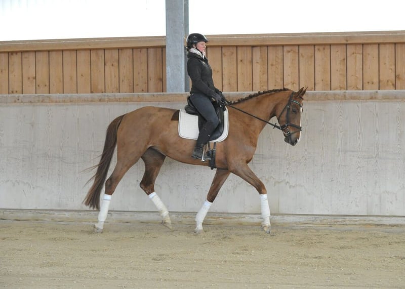 Sehr schicke, qualitätsvolle, 5-jährige Dressurstute mit bester Abstammung, gezogen über Sezuan, Donnerhall und Weltmeyer. Eine bewegungsstarke, absolut rittige Dressurnachwuchsstute mit bereits Platziereungen in Dressurpferde-Prüfungen der Kl. A. Sie präsentiert sich mit sehr elastischem Bewegungsablauf, ist dabei sehr gut zu sitzen und begeistert mit tollen Reiteigenschaften. Eine tolle Nachwuchsstute ohne Fehl und Tadel, lässt sie das Reiterherz höher schlagen.