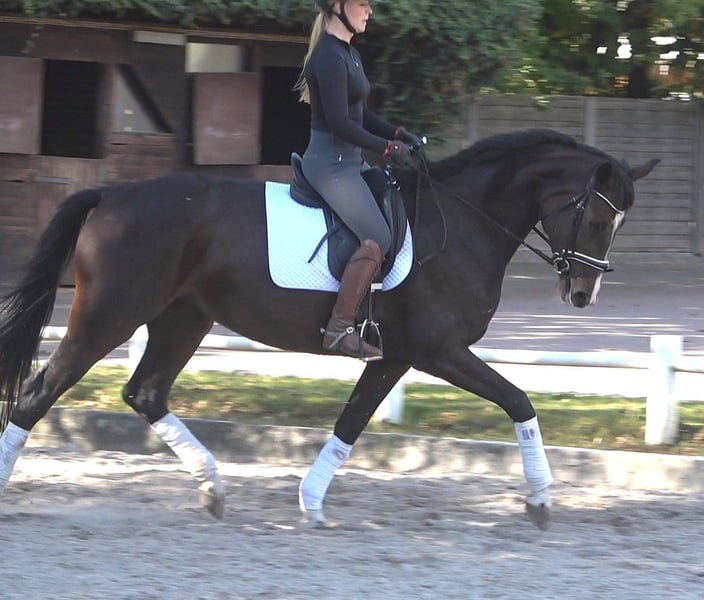 Quilena besticht nicht nur durch ihr hübsches Aussehen, sondern auch durch ihre kraftvollen und doch eleganten Bewegungen. Sie wurde schonend angeritten und bewegt sich auf sicherem A-Niveau,, auch die meisten L-Lektionen beherrscht sie schon und je anspruchsvoller die Lektionen werden, um so konzentrierter und leistungsbereiter scheint sie zu werden.. Sie will gefallen, wirkt manchmal noch etwas unsicher, Hänger fahren findet sie noch etwas aufregend, aber auch da üben wir und macht sie Fortschritte. Ein sehr guter Rö TÜV, inclusive Hals und Rücken liegt vor. Wir wünschen uns für sie einen Reiter, der Sicherheit und Vertrauen gibt. Quilenas Vollbruder Quintessential ist in Hannover gekört, wurde Hengstleistungssieger im 2-Tagestest mit der "Traumnote 8,94" (Galopp 9,7) wurde 3.-jährig Vizelandesmeister und fürs Bundeschampionat der 3-jährigen Hengste nominiert. Auch ihr Vater Q-Sieben hat 3-jährig seinen 14-Tage-Test als Dressursieger mit der Note 8,71 und einer 9,5 für die Rittigkeit und wurde Vize-Champion beim Oldenburger Landesturnier in Rastede. Auch mütterlicherseits verfügt Quilena über ein sehr gutes Pedigree aus einem alten Hannoveraner Stutenstamm von 1883. mit zahlreichen hochpreisigen Elite Auktion -Fohlen und - Pferden. des Hannoveraner Verbandes und Siegerfohlen. Die 3. Mutter Debatte gebar den gekörten Hengst Edinburgh und den bis St.Georg erfolgreichen Weltgraf II. Auch der erfolgreiche Laudabilis mit zahlreichen gekörten Söhnen aus der Schwester zu Debatte stammt aus dem alten Stutenstamm von 1883. Quilena, eine Stute mit ehrlichem Charakter, herausragenden Bewegungen in allen 3 Grundgangarten, die hoch hinaus will, und der eine große erfolgreiche Dressurkarriere bevortehen kann.