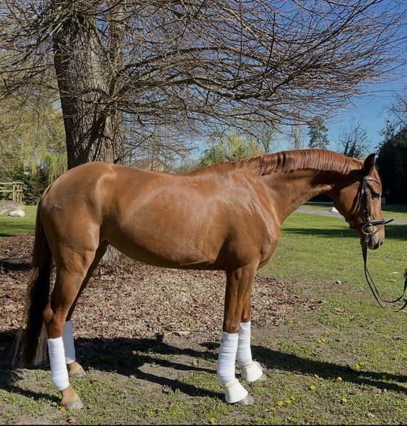 On behalf of A 5-year-old, very beautiful, long-legged dressage mare by Bon Courage for sale This mare possesses a truly exceptional rideability that brings daily absolute joy. She is incredibly comfortable to sit on, so even riders who find it difficult to sit out can easily manage her. She has a very smooth, flowing movement and three excellent gaits. She is very light in the contact and responds well to the aids. Her character is wonderful—very sweet and affectionate. She is also familiar with cross-country and new environments. Overall, she is very straightforward, charming, and easy to handle. When groomed, she simply stands quietly tied up and waits patiently. A fantastic training horse with quality, rideability, and a clear mind. Location: Hamm For interested parties, please call 017661987617 Video from April 8, 2026 Rider’s height: 1.80 m The horse is tall and long-legged but not overly large or heavy. From above, her size is hardly noticeable.