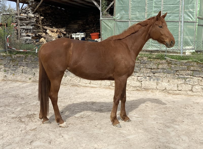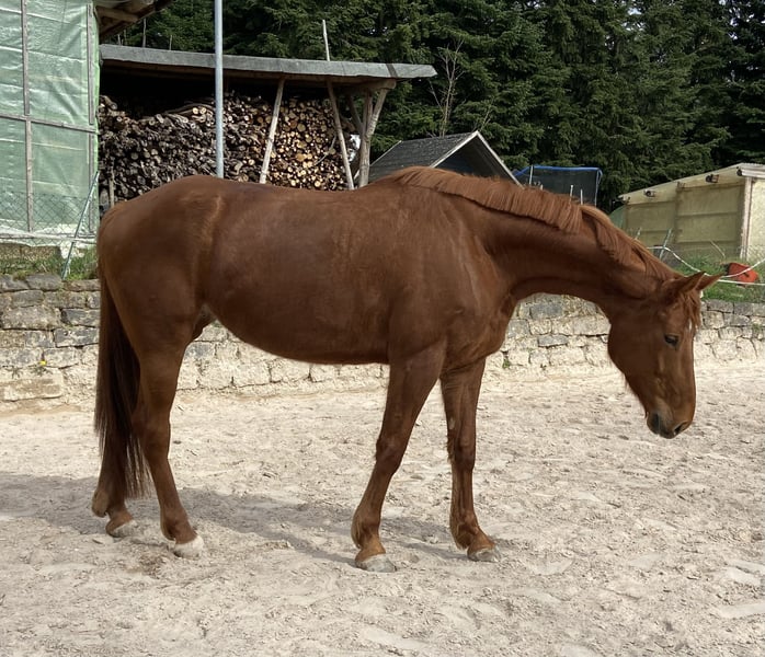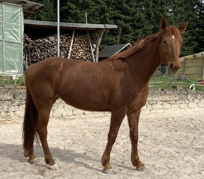Jolie jument alezane expressive – partenaire idéal pour loisirs et sport À vendre, une magnifique jument alezane de 6 ans (née en 2020) mesurant environ 1,65 m au garrot. Origines : Côté maternel, issue d’une jument primée d’État par Weltmeyer * Werther, côté paternel, par Don Frederico. Caractère et comportement : Notre jolie jument séduit par sa nature amicale et sociable. Elle vit actuellement dans un groupe mixte, où elle occupe une place médiane et est très ouverte à l’égard des nouveaux chevaux. Dans le quotidien, elle se montre sage. Le maréchal-ferrant et le vétérinaire (vaccinations, vermifuge) se passent sans problème. Cependant, dans des situations inhabituelles, elle peut parfois tester ses limites – ce qui en fait donc une monture non adaptée aux débutants. Éducation : Elle travaille avec motivation et assiduité sur la carrière. Elle tente occasionnellement le saut seul en extérieur ou lors du travail à la longe, ce qui nécessite un cavalier sûr de lui et cohérent. En groupe, elle est fiable et calme en extérieur. Elle montre également un joli saut, sans que cela ait été spécialement travaillé. Élevage : Elle ne sera pas confiée en box pure, car cela la rendrait insatisfaite. Elle préfère un box en paddock ou un paddock actif, où elle peut se déplacer librement. Santé : - Pas d’eczéma - Aucune allergie à la poussière - A eu un sarcoïde équin, enlevé à l’âge de 3 ans, qui n’est pas revenu depuis. Divers : La jument est née chez nous et connaît la vie quotidienne à la ferme avec des enfants, des chiens, des chats et des machines agricoles. Foyer idéal : Nous souhaitons pour elle un foyer aimant, avec un encadrement régulier et une gestion claire et équitable. En raison d’un ajout familial, nous ne pouvons malheureusement plus lui offrir l’attention qu’elle mérite actuellement. 📍 Localisation : 76571 Gaggenau