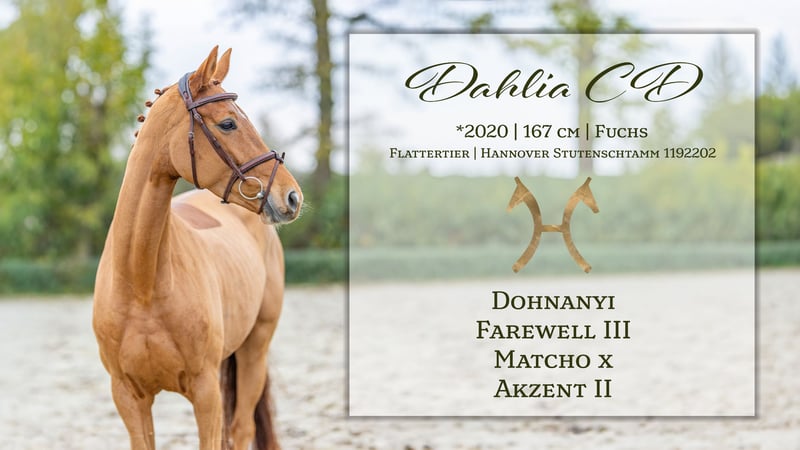Zum Verkauf aus Züchterhand steht Dahlia CD, eine moderne, blutgeprägte, doppelt veranlagte Fuchsstute, geboren am 14.02.2020, von hervorragender Qualität. Dahlia CD überzeugt als elegante, bewegungsstarke und sehr rittige Stute mit angenehmem Temperament und der richtigen Einstellung zur Arbeit. Sie präsentiert sich stets gutmütig, aufmerksam und intelligent. Sie steht körperlich noch in der Entwicklung und ist noch nicht ganz Pferd Besonders hervorzuheben ist ihr menschenbezogenes, verschmustes und neugieriges Wesen. Unarten wie Buckeln oder Steigen sind ihr völlig fremd. Die Stute wurde schonend im Jahr 2024 angeritten und konnte bereits in Dressur- und Springprüfungen der Klasse A* und A** Schleifen erzielen. Im Training geht sie Lektionen auf L-Niveau. Dank ihrer Vielseitigkeit macht sie in allen Sparten eine sehr gute Figur und wäre auch für die Vielseitigkeit bestens geeignet. Mit ihrem Charakter und ihrer Einstellung wird Dahlia CD zukünftig ein idealer, zuverlässiger und ehrlicher Sportpartner sein. 📞 Kontaktieren Sie uns gerne für weitere Informationen oder zur Vereinbarung eines Kennenlerntermins. Abstammung Vater: Dohnanyi – Sieger im Hannoveraner Reitpferdechampionat der 3-jährigen Hengste in Verden – Bronzemedaille Bundeschampionat 2017 in Warendorf Mutter: Fiorella CD – Stark doppelt veranlagt – Sensible Art bei hoher Leistungs- und Versammlungsbereitschaft https://www.horsetelex.de/horses/pedigree/2130499/dahlia-cd Aus dem leistungsstarken Stutenstamm der Mutter stammen zahlreiche Auktionsfohlen, erfolgreiche Reitpferde sowie mehrere gekörte Hengste im Springen und in der Dressur bis hin zu international erfolgreichen Sportpferden.