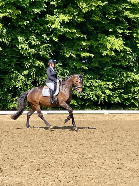 We offer our exceptional 6-year-old mare Exceptional for sale – a true breeding product of our stud with excellent sporting prospects and significant breeding background. Exceptional is approximately 1.66 m tall, dark brown, elegant in appearance, and moves with outstanding quality: her trot is elastic and lively, and her canter is powerful and well-balanced – movements that leave an impression even in the arena. Under saddle for about 8 months, she shows herself to be very rideable, eager to learn, and with the right measure of sensitivity. Despite her still young training, she has already competed in four tournaments and has placed three times – a testament to her talent, nerve strength, and character. Pedigree: Exceptional comes from our own breeding line: her sire is the internationally sought-after top stallion Escamillo, also bred by us, and her dam is a daughter of Destano. This gives her the best genetic prerequisites for modern dressage sport. She has also already proven herself in breeding. Key data at a glance: • Name: Exceptional • Age: 6 years • Height: approx. 1.66 m • Color: Dark brown • Training level: Dressage horse L • Competition successes: 3 placements from 4 starts • Pedigree: by Escamillo – Destano (both parents bred by us) Exceptional is a special opportunity for ambitious riders looking to bring a quality young horse with potential into the sport. For serious inquiries, we look forward to hearing from you. We are happy to provide further information, photos, and videos upon request.