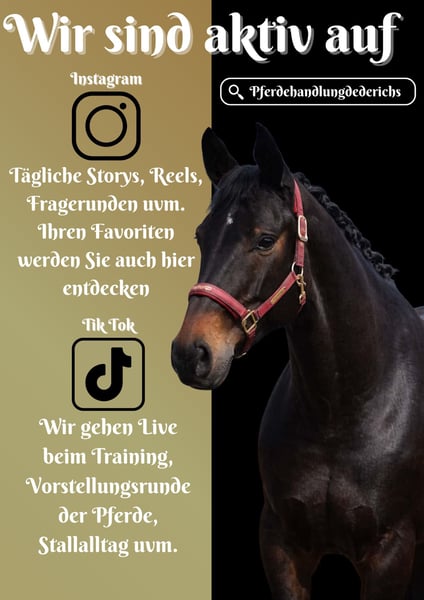 Rieka ist eine 6 Jährige Hannoveraner Stute ca. 1,68 cm v. Rubin Royal, Rubinstein, Grundstein II x Dancier, De Niro, Donnerhall *Rieka* ist eine wunderschöne ausdrucksstarke Stute mit 3 sehr guten GGA. Rieka wurde vielseitig ausgebildet und bereitet viel Freude. Die schöne ist leichtrittig und super leicht durchs Genick zu reiten. Sie geht brav alleine und in der Gruppe ins Gelände, kennt auch Wasser und fremde Umgebungen. Sie eignet sich super auch für Jugendliche. Ein Pferd welches sportlich viel Qualität mitbringt aber trotzdem kopfklar ist. Ein Hingucker in jeder Hinsicht mit super Charakter. Im Umgang auch unkompliziert und schmusig. Pferdehandlung Dederichs – Ihr Partner für den Pferdekauf Kontakt & Erreichbarkeit: Anfragen bitte ausschließlich telefonisch unter 0173/9792139 Montag – Freitag: 09:00 – 18:00 Uhr Samstag: 09:00 – 15:00 Uhr Sonntag: Ruhetag Folgen Sie uns auf Social Media! Erleben Sie unseren Alltag mit den Verkaufspferden auf Instagram, TikTok & Facebook unter Pferdehandlung Dederichs Rabatt: Bei sofortiger Mitnahme Ihres neuen Traumpferdes erhalten Sie zwischen 5 %– 10 % Rabatt Probereiten & Vorführen: • Probereiten: 40 € pro Pferd (max. 2 Reiter), Betrag wird beim Kauf angerechnet • Feiertage: Proberitt 50 € • Vorführung durch unsere Bereiter: 30 € pro Pferd (Vorreiten, Bodenarbeit etc.) Ankaufsuntersuchung & Transport: • Viele unserer Pferde besitzen bereits eine AKU • Sie können selbstverständlich Ihren eigenen Tierarzt mitbringen • Gerne organisieren wir eine Untersuchung • Wir unterstützen Sie auch gerne beim Transport ins neue Zuhause Weitere Verkaufspferde: In unserem Stall stehen weitere Verkaufspferde, die noch nicht online sind. Falls Ihr Traumpferd noch nicht dabei ist, zögern Sie nicht, uns zu kontaktieren. Wichtige Hinweise: • Stockmaß-Angaben sind geschätzt und nicht exakt nachgemessen • Alle Beschreibungen sind subjektive Einschätzungen des Verkäufers und keine zugesicherten Eigenschaften