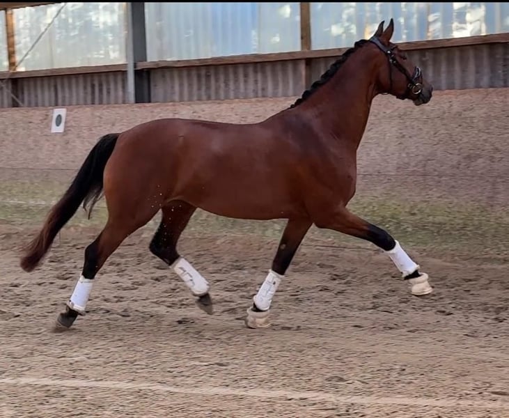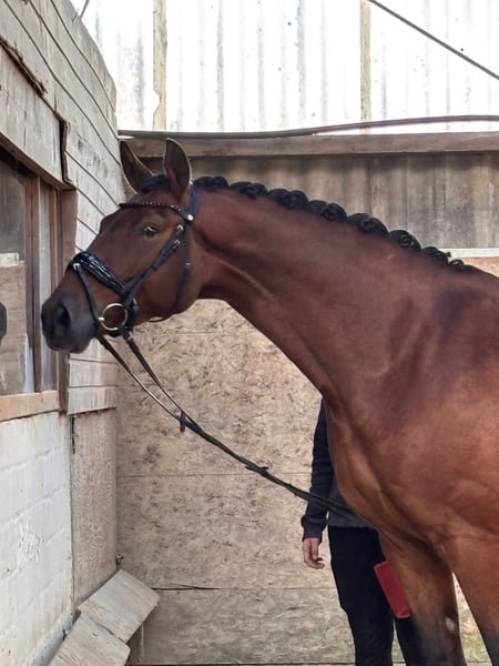 Elegant Hanoverian mare for sale – ideal for dressage We are offering a beautiful dark brown Hanoverian mare, born in 2020. Standing at 16.1 hh, she combines impressive size with a graceful appearance. She is well-suited for dressage and demonstrates great talent and a willingness to learn. This charming mare impresses with her excellent pedigree, her pleasant temperament, and her versatile potential. She is healthy, raised in a herd environment, and is in good condition. Please feel free to contact me for more information or if you are interested. Viewing and test rides are available by appointment.
