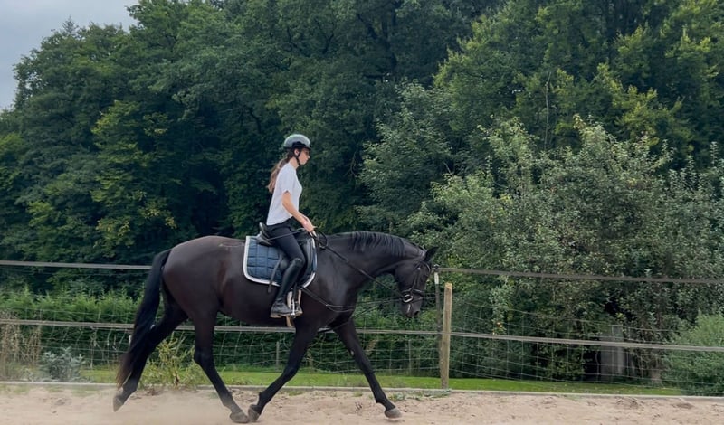 Bellina is my 6-year-old tall, dressage-bred mare with excellent riding comfort. "Bella" is a very people-oriented, friendly, and fearless horse. She has been started slowly and calmly. So far, she has been worked in the arena as well as out on trails. Due to her lineage, she was supposed to be my dressage prospect, but unfortunately, I have to part with her due to a lack of time. Currently, she is in a mixed open stable herd and gets along very well with all other horses.