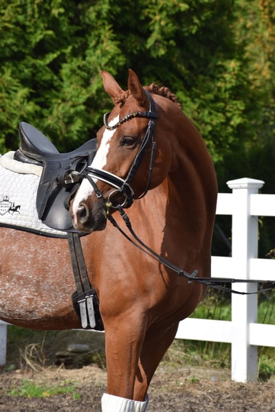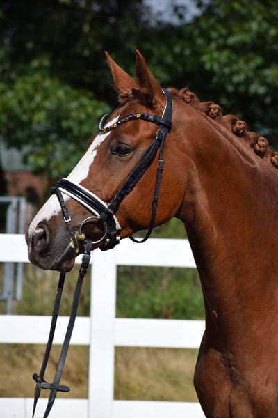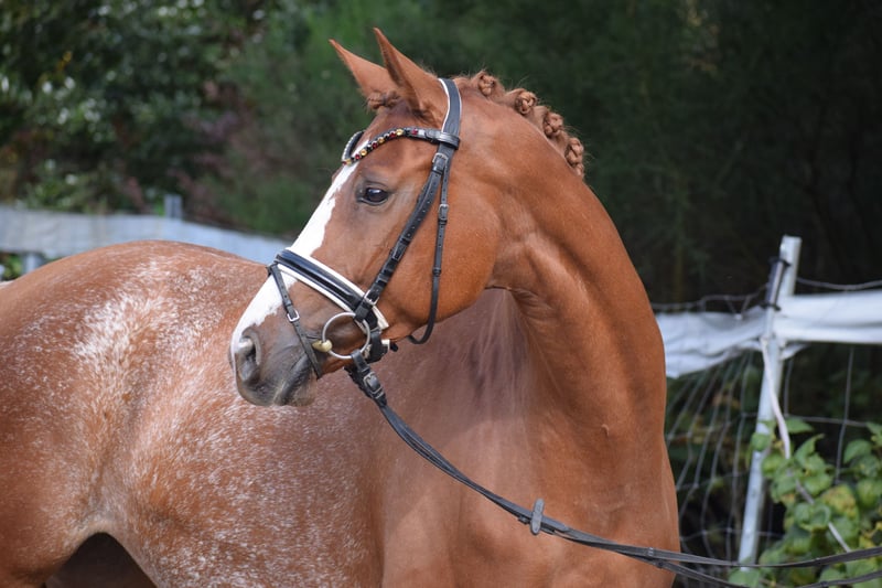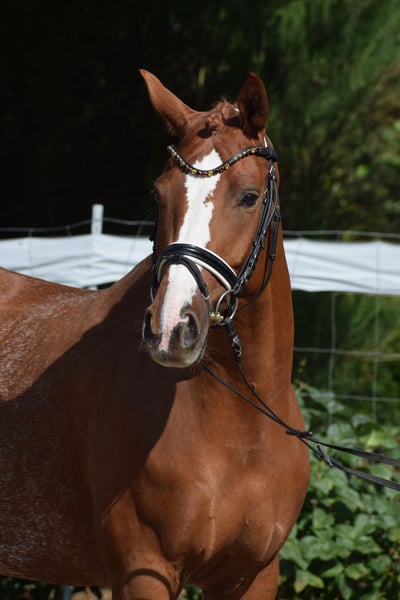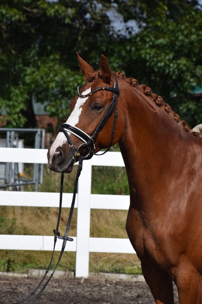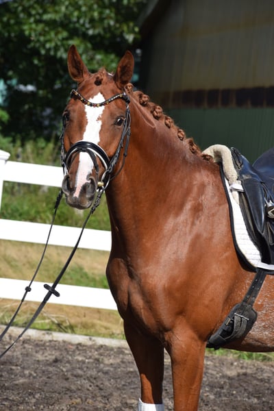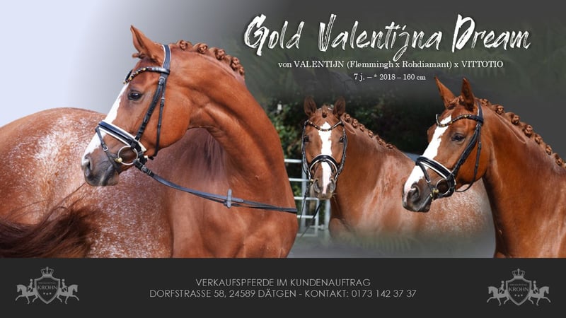 BRAVE ALL-ROUNDER SUITABLE FOR EVERYONE (SCHOOL HORSE - RIDING BADGES - HUNTER) - WITH A DREAM CHARACTER & WONDERFUL APPEARANCE - SUITABLE FOR CHILDREN TO RIDE - IDEAL FOR JUNIORS - FAMILY HORSE For sale on behalf of the owner is this charming, beautiful 160 cm tall, 7-year-old, colorful chestnut mare, sired by VALENTIJN (Flemmingh x Rohdiamant) x VITTOTIO. "VALENTIJNA" impresses on many levels. Visually, she captivates with her unique colorful chestnut coat, blaze, typified face, well-muscled neck, and harmonious conformation. She is a fantastic teacher for less experienced riders at the A level but also brings joy to any versatile rider, as she enjoys working in the arena, in the jumping course, or out on trails. Therefore, "VALENTIJNA" would also be an ideal family horse and a horse for everyone. A great horse to achieve your riding badges and participate in competitions while having a lot of fun. When "VALENTIJNA" moves, it becomes clear that she is a fit, stylish pony. Her movements are rhythmically carried, balanced, with freedom in the shoulders, propulsion, push-off, uphill tendency, and carrying power - all developed from a well-working and load-bearing hind leg, through a swinging back with good self-carriage. "VALENTIJNA" could also remain in professional training with us after purchase. A current good vet check is available: clinical + X-ray.