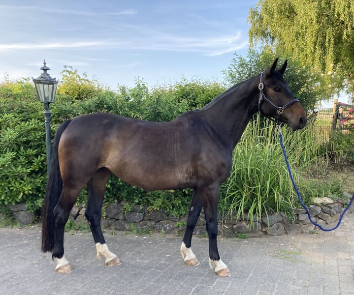 **Sales Advertisement: Dreamy Hanoverian Mare for Sale** For sale is a beautiful Hanoverian mare, born in 2019. This elegant dark bay lady stands at 164 cm and impresses with her appealing stature and harmonious appearance. The mare is well-suited for leisure riders with dressage ambitions and already shows promising progress in her training. She has good basic gaits and a pleasant temperament, and she is particularly well-behaved in the field, where one can already relax on a long rein at the beginning of her training. She is easy to handle, well-mannered, and has a friendly character. Additionally, she loads onto the trailer very calmly and loves to be bathed. This wonderful mare is now looking for a loving new home where her character will be appreciated. Flamenca was initially used as a broodmare and was therefore started under saddle later. If you are interested or would like more information, please feel free to contact me. Viewings are possible by appointment. Let yourself be enchanted by this wonderful mare!