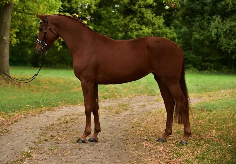 Elegant Hanoverian mare for sale – ideal for show jumping riders! This beautiful chestnut Hanoverian mare was foaled in 2019 and impresses with her striking appearance and excellent jumping ability. Standing at 16.9 hh, she is a remarkable partner, convincing both through her size and her strong character. She has a solid basic training in jumping and shows great potential for competition or ambitious leisure riding. Her friendly nature and eagerness to learn make her a delightful companion. If you are interested or would like more information, please feel free to contact me. Get in touch to learn more about this talented jumping mare!