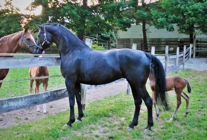 Imposing Black Pearl "Gala Night" by Glamourdale x Weltmeyer x Brentano II - 7 years old - 16.1 hh - Black mare - Solid, correct conformation - Strong typy resemblance to her sire - Mare book score 8.0 - Registered in Hannover and Oldenburg - WFFS negative (The mare can stay with us for foaling, rebreeding, or until weaning if desired.) She is a good mother, handles well, with uncomplicated foaling and upbringing, from a fertile lineage. She has already produced two very good, movement-rich colt foals by Escolar, with correct conformation and especially great temperaments. Her first son, now 3 years old, was particularly easy to start. Gala Night herself has not been ridden but is familiar with a girth, at least from Birthalarm. Numerous licensed stallions, state premium mares, and sport-successful offspring originate directly from her dam line, even in close relatives. Therefore, her rideability is well-secured within her pedigree. Gala Night’s dam, "Weltklasse," is the full sister to the licensed stallions "WORLDLY I (LB Celle)," "WORLDLY II (PB RUS)," and "WALCHENSEE" (PB RUS). Additionally, Gala Night’s half-sister Quarta by Quaterback is the dam of the 2020 Oldenburg Siegerhengst "FORTUNATE" by Foundation (Helgstrand) and his licensed full brother "FOR MAGIC" (Rüscher-Kohnermann). The full sister of Weltklasse, "Whisper," is the dam of the licensed stallion "BOWINGHAUSEN" by Bonds (HuL Marbach). The half-sister of Weltklasse, "Werther Echte" by Werther, is the dam of the licensed stallion "ST. WERTHER" by Sandro Hit. Several state premium mares and sport-successful offspring up to Inter I level are also found within her close family. This is just a brief insight into our dam line (the Shillon dam line), which we have maintained and developed over more than 30 years across many generations. An ideal mare for those starting in breeding or for quality expansion of a breeding program. She will only be placed in good hands if the chemistry and circumstances are right. Otherwise, we are very much looking forward to her foal by V-POWER in May 2026! Interested parties can request a video. Questions can initially be sent via email to info@zuchthof-vogel.com and later also answered by phone.