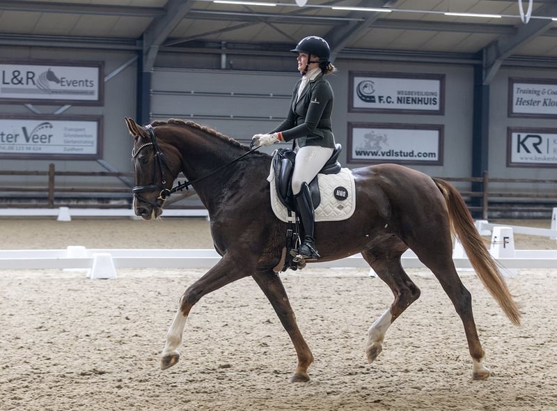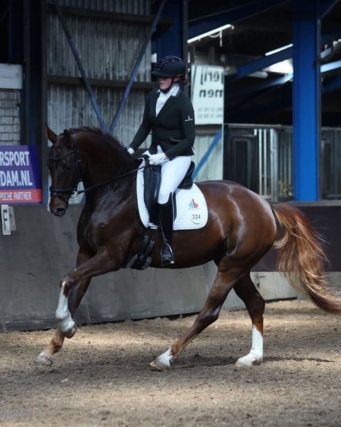 Seven-year-old mare from dressage bloodlines Sezuan’s Donnerhall x Dancier, with strong aptitude, presence, and an excellent work ethic. This mare is classified at M1 level, has mastered multiple Z-level movements, and can perform a flying change. She has competed several times at the Groningen Championships and participated in the IICH, where she competed in the L kür freestyle. Additionally, she achieved third place in an L2 dressage competition. Besides her strong dressage talent, she displays a pleasant and functional jump. This makes her suitable not only for dressage but also for show jumping and possibly cross-country work, appealing to riders with broader sporting ambitions. In handling, she is well-behaved and honest. Under saddle, she is a pleasure to ride, though she has character: an energetic mare with presence and a very good work ethic. She is eager to learn and willing to work, making her suitable for an ambitious rider aiming to progress in the sport. Price: €32,500 📍 More information, videos, and test rides available upon request. 📞 Serious inquiries only.