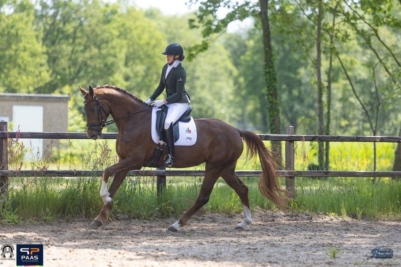 7-jarige merrie uit de dressuurlijnen Sezuan’s Donnerhall x Dancier, met veel aanleg, uitstraling en een uitstekende werkinstelling. Deze merrie is M1 geklasseerd, beheerst meerdere Z-oefeningen en springt een groene wissel. Ze heeft meerdere keren mogen starten op de Groninger kampioenschappen en verscheen aan de start tijdens de IICH, waar zij uitkwam in de L kür op muziek. Daarnaast behaalde zij een 3e plaats in een L2 dressuurcompetitie. Naast haar sterke dressuuraanleg laat zij een leuke en functionele sprong zien. Hierdoor zou zij zich, naast de dressuur, ook goed kunnen lenen voor het spring- en eventuele crosswerk, wat haar interessant maakt voor ruiters met bredere sportambities. In de omgang is zij braaf en eerlijk. Onder het zadel is zij fijn te rijden, maar wel met karakter: een merrie met energie, uitstraling en een zeer goede werklust. Ze denkt graag mee en wil werken, wat haar geschikt maakt voor een ambitieuze ruiter die verder wil in de sport. Vraagprijs: € 32.500 📍 Meer informatie, video’s en proefrijden op aanvraag. 📞 Alleen serieuze interesse.