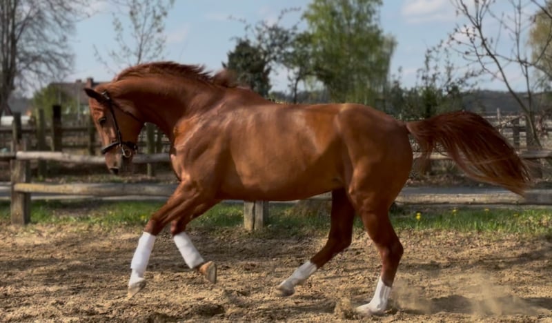 Pretty charming chestnut mare with a lot of charm and expression! 6 years old, born in 2019, 1.72 cm tall. Floriscount / Worldly - De Niro - Western Star - Grande The mare is being sold well below her value due to a finding and therefore will not be sold as a riding horse. Hence the price. This is not an urgent sale!! She could certainly do well in front of a carriage, continue with groundwork, lunging, circus lessons for horses, or be interesting for breeding. Whether she could ever be rideable, I cannot say, so I exclude this in the sale!! Very attractive, charming, lovable, and affectionate mare with spirit, presence, and that certain something is looking for a loving 5-star home. The mare was raised by me and carefully brought up with a lot of love and understanding. She has lacked nothing. She has always been well mineralized and fed, with very good roughage available at all times. From the beginning, her hooves were regularly attended to, her teeth checked and done every year, and osteopathic treatments were carried out regularly when needed. She always had plenty of turnout on large areas, could stay with her mother for a year, and was weaned with a lot of sensitivity. She is lovable to handle and can be led, groomed, and tied up by anyone. She knows and likes water and being hosed down, loves children, dogs, and cats very much, and is also easy to lead and hold in the terrain with a halter and rope. She is well acquainted with a riding saddle and lunging girth, and there are no issues with that. She is worked with regularly. The riding arena with mirrors and outdoor areas right next to a busy road is also no problem. She is road-safe (tractors, trucks, motorcycles, cars with trailers) – all no problem. Farrier, veterinarian, and trailer loading are also no problem. She is familiar with groundwork, desensitization training, double lunging, jumping work on the lunge, or free jumping and does everything well. She is very intelligent, sensitive, and learns incredibly quickly. She wants to please and enjoys working with people. She is never stubborn or unwilling. She is always curious and open to new experiences. She is familiar with box stalls, paddocks, open stable housing, and 24-hour turnout in a mixed herd – all no problem. No eczema, no dust allergy, no cough, and she tolerates various horse feeds well. She has a very good pedigree and excellent gaits. Equipment can be purchased if desired. Bridle and Micklem, a fitted almost new dressage Passier saddle, sheepskin girth, saddle pad, boots, bell boots, and matching blankets (cooler, rain blanket, thicker outdoor blanket) can be purchased additionally. I wish for the mare, if possible, a permanent home, as she is very dear to me, and I will only give her into truly verifiably good hands with a protection contract. The mare will not be sold to dealers!! Only serious inquiries will be processed. The mare is located in a riding stable and can be presented at any time for serious interested parties. Home before price!
