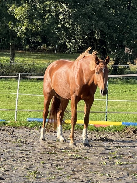 For sale directly from the breeder: this beautiful Hanoverian chestnut mare by Zinedream out of an Earl x Wildfang dam, born in May 2019. She was gently backed at a late age and has completed her first jumps and trail rides. Unfortunately, due to my limited time, she has not been further developed. Given her current training level, she is not suitable as an beginner's horse but definitely has the potential. She is very responsive and easy to handle, and she is extremely gentle in her manner. She loves being around children, is familiar with dogs, cows, and other animals, and is accustomed to tractors and quads nearby, although she does not particularly like them. She currently stays in an open stall during the day and in a box at night. Due to her limited training and a superficial injury to her front leg that still requires care and attention, she is being sold well below value. A jumping saddle adjusted in October and additional tack can also be purchased. At the moment, she is not in training due to her ongoing recovery, so trial riding is not possible. However, videos with a rider from last year are available and can be sent upon request. There is also a video showing various sequences in turnout (the latest ones are from January 2026, in the snow). She grew up as our first foal on the farm, but I am unable to keep her for personal reasons. I am looking for a loving home where she can have a meaningful task. With proper training, she will certainly be able to compete at shows; however, I am selling her as a leisure horse. If you are genuinely interested, please feel free to contact me.