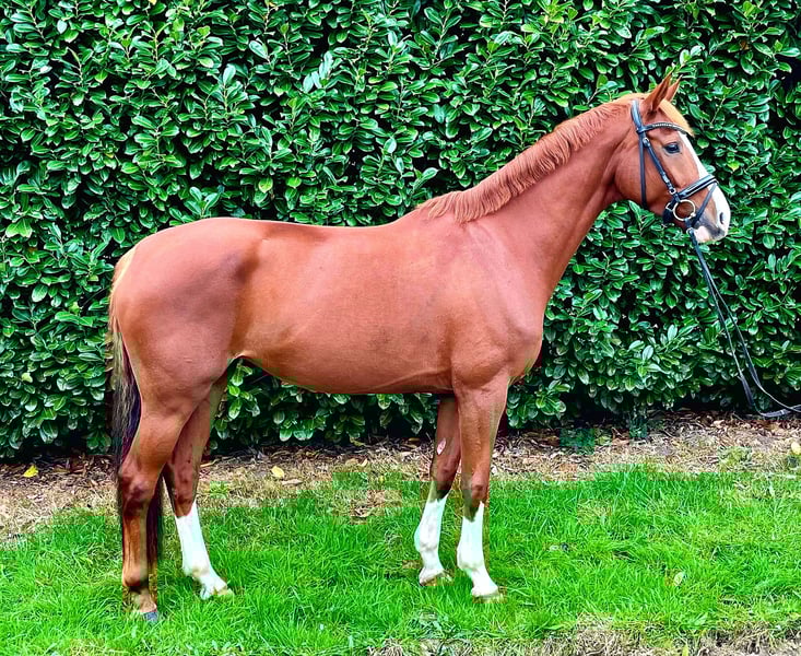 Vella is a 7-year-old state premium mare who had a foal by Duplexx when she was 6 years old. She was gently backed at the age of 4 and was already able to place highly in show jumping classes A and L at the age of 5, and this year she was able to pick up right where she left off after her break. Vella not only excels in jumping but also possesses good basic gaits, allowing her to be successful in dressage with appropriate training. Vella is very well-behaved both in handling and under saddle, and she has a pleasant go. Weaker riders are no problem for her. Of course, she is also well-behaved in the field, whether going out alone or in a group. Vella is good for the farrier and loading. Unfortunately, she does crib, but it does not cause her any issues.
