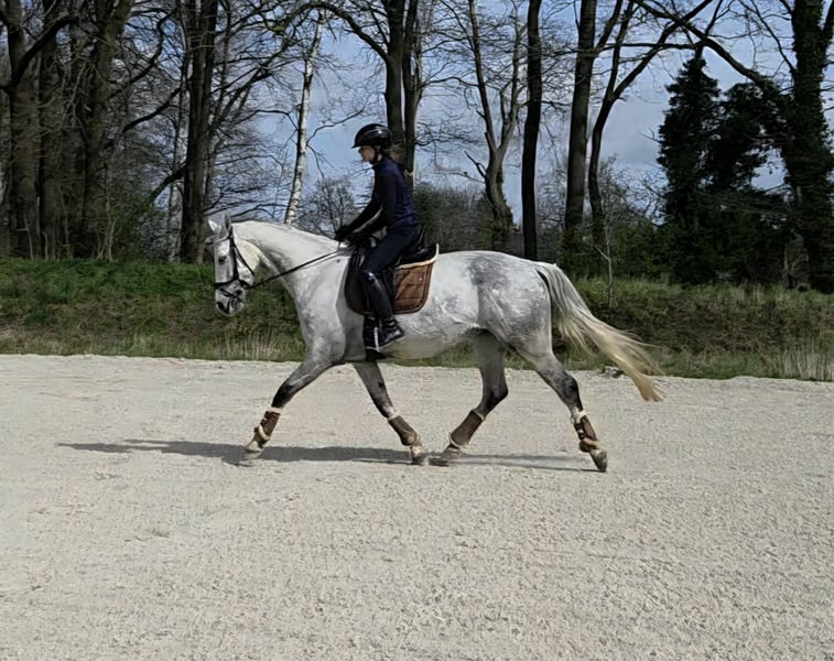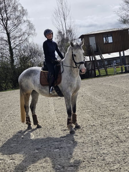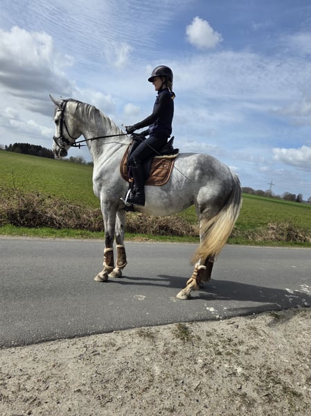 I am selling my beautiful head-clear grey mare with a height of approximately 1.68 m, full papers, and breeding registration. Doro is a true all-rounder, very eager to learn, and well-behaved in handling. She can be ridden both indoors and outdoors. She enjoys ground work and is happy to jump occasionally. Always motivated and reliable. If desired, she can also be used for breeding. I decide on a case-by-case basis, as I notice she sometimes wants to jump, which I unfortunately cannot do. She gently guides a rider who is returning to riding through the arena. Her teeth were checked in 2025. She is regularly vaccinated, dewormed, and receives manual therapy. She is registered as a broodmare. X-ray images are available without any findings. Doro is accustomed to both stall and paddock or open stable living. She can be test ridden by appointment.