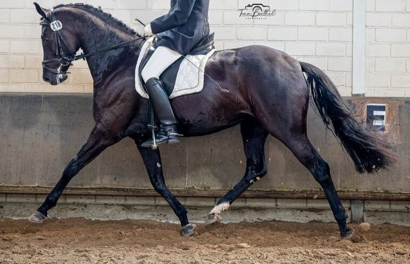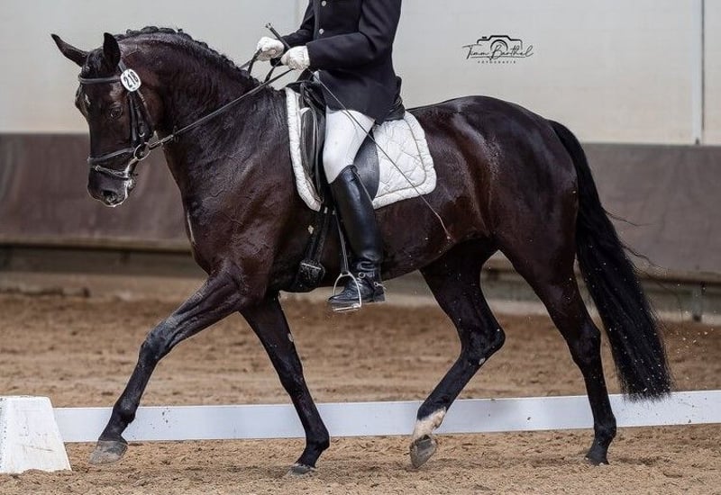 **Sales Advertisement: Beautiful Hanoverian Mare for Sale** For sale is an impressive Hanoverian mare, born in 2018. This elegant black mare captivates not only with her striking color but also with her friendly disposition and versatile talents. **Features:** - **Breed:** Hanoverian - **Gender:** Mare - **Year of Birth:** 2018 - **Color:** Black - **Height:** 172 cm The mare already shows promising progress in her training and has the potential for both competition and recreational riding. She is well-mannered, well-ridden, and suitable for both experienced riders and ambitious beginners. She is healthy, regularly vaccinated, and dewormed. If you are interested or have any further questions, please feel free to contact me. Visit us and see for yourself this wonderful mare! Placings: Dr. Pf. A 2x 2nd place, 2x 3rd place, 2x 5th place Dr. Pf. L 1x 3rd place Dr. L won with a score of 8.0 was successful both outdoors and in the arena, a horse for the big rectangle on the way to Dr. Pf. M. very nice traverses, already quite secure changes The mother is a state premium mare with many sporting successes up to S level in dressage. In her mare performance test, she received a score of 9 twice for her rideability, which she has also passed on to her daughter, mare line in Hanover of Shocolata, like Don MARTILLO.