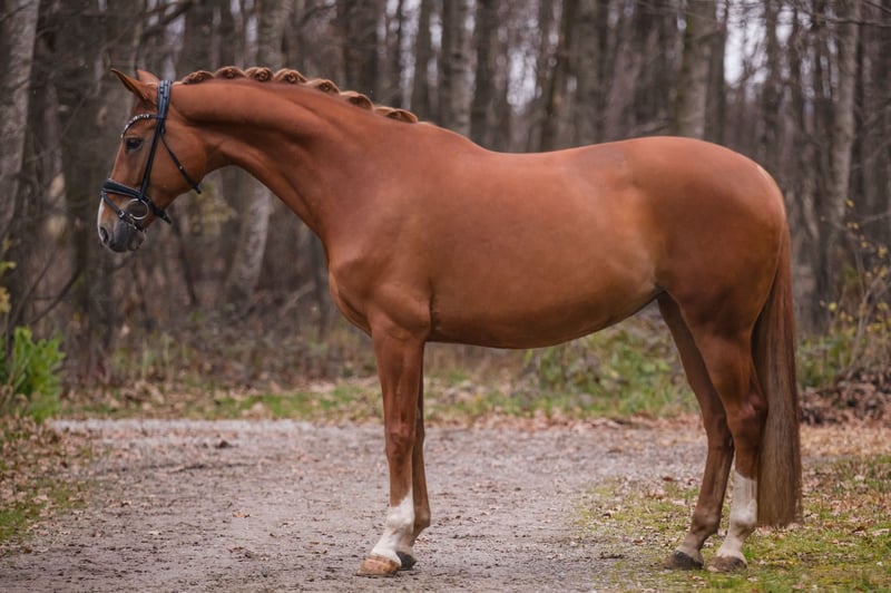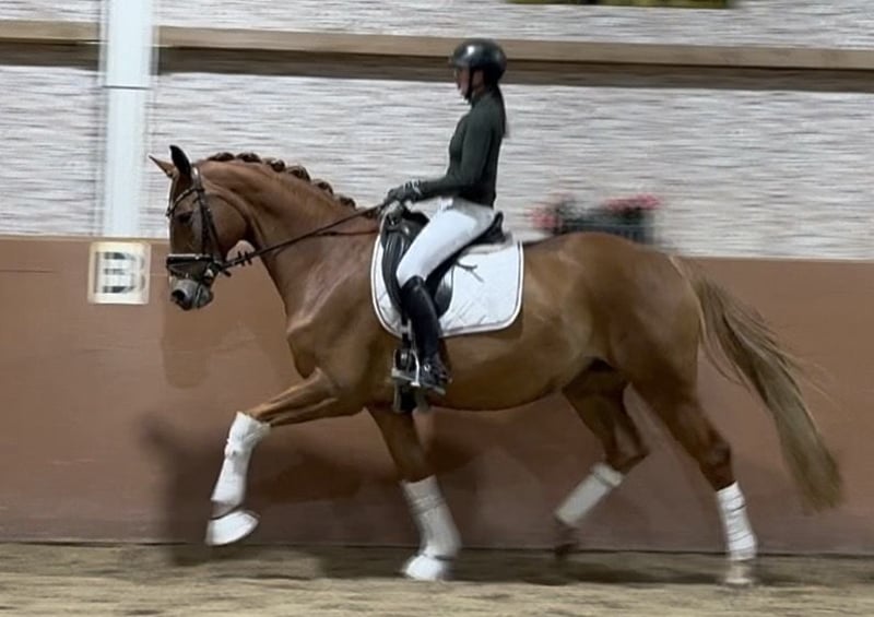 Dear Interested Parties, To schedule a test ride, please send me a WhatsApp message. For further questions, I am available via WhatsApp during the day, and you can reach me best by phone between 4 PM and 7 PM. I look forward to hearing from you. www.angelina-devittorio.de ⭐️Darina⭐️ Age: 9 years (2016) Height: approximately 16.1 hh Pedigree: Dondante x Weltbürger Training level: Basic dressage, leisure riding Health: Good health certificate including X-rays available For sale is a charming, stunning chestnut mare by Dondante, who impresses with three excellent basic gaits. Her walk and trot mechanics, especially her active hind leg, are particularly noteworthy. This mare has a lovable, human-oriented character and is consistently calm, friendly, and uncomplicated in daily handling. She strives to please her rider and is very people-focused. Under saddle, she requires a somewhat experienced rider, as she can sometimes be a bit strong in contact. She is never mean or difficult, but not suitable for complete beginners or nervous/unsure riders. However, she is ideal for ambitious amateurs at a good A-level! She has been ridden mainly for leisure and is trained at A-level, but shows great potential for further development. With proper support, she has the potential for more! A wonderful, characterful mare with lots of heart and quality – all at a very attractive price.