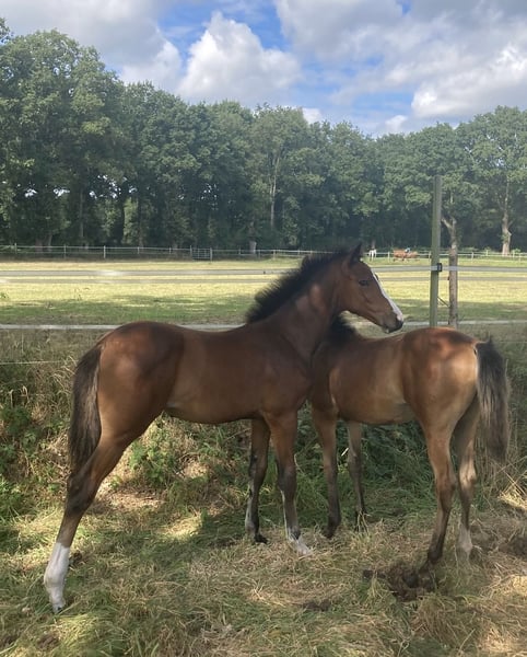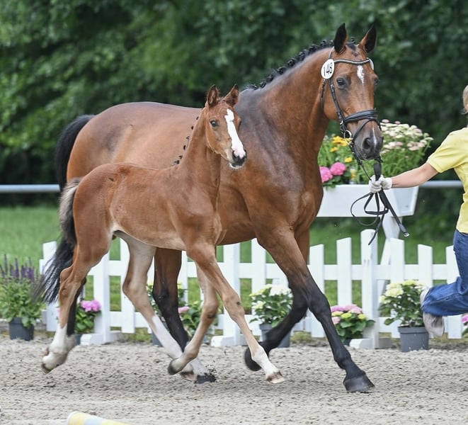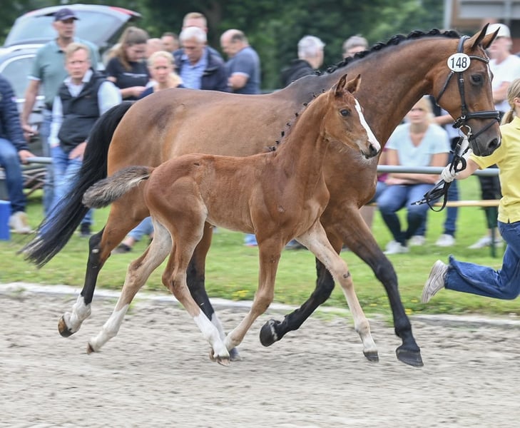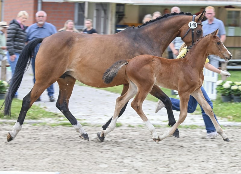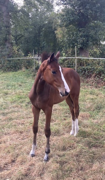 Hannoveraner Stutfohlen mit sehr viel Qualität und Potential für Dressur, Springen und Vielseitigkeit. Preis VB zzgl. Mehrwertsteuer Dieses edle Hannoveraner Stutfohlen vereint moderne Typausprägung, Leistungsbereitschaft, Vermögen und ein wunderbares Interieur. Abstammend von Vidar, doppelt veranlagter Celler Landbeschäler, der großrahmig und mit gutem Talent am Sprung eine lückenlose Karriere als Dressurpferd bis zum Grand Prix vorweisen kann. Seine Abstammungstafel baut auf vornehmlich springbetonten Vorfahren auf, bei deren Selektion auf gute Grundgangarten und unkomplizierte Reiteigenschaften Wert gelegt wurde. Vater Viscount vererbt Rittigkeit und Leistungsbereitschaft und kann über 350 eingetragene Sportpferde vorweisen. Vidar, der für Rittigkeit, Vermögen und Ausstrahlung steht, selbst bis S*** erfolgreich in der Dressur unterwegs ist und über Viscount, Contendro und Edward beste beidseitige Veranlagung mitbringt, wurde hier mit einer holsteinisch geprägten Stute angepaart, die über Quintender x Clinton I genetisch im Springsport den höchsten Ansprüchen gerecht wird. Charakter & Auftreten: Dieses Fohlen zeigt sich aufmerksam, lernfreudig und absolut menschenbezogen. Sie ist bereits total brav beim Schmied und hat beim ersten Mal ohne Zögern die Hufe gegeben – ein echtes Verlasspferd in der Entstehung, das bei uns täglich an der Hand unterwegs ist. Bewegung & Veranlagung: Mit ihrer ausdrucksstarken, bergauf gesprungenen Galoppade, dem kraftvollen Hinterbein und viel Elastizität zeigt sie großes Potenzial für alle Sparten des Sports. Dazu kommt ihre Vielseitigkeit in der Abstammung – beste Voraussetzungen für eine erfolgreiche sportliche Zukunft oder den züchterischen Einsatz. Besonderheiten: • Langbeinig, elegant, mit modernem Typ • Vorsichtig und leistungsbereit • Beidseitige Veranlagung genetisch abgesichert • Springvermögen • Lieb im Umgang und sehr kooperativ • Überdurchschnittliche Grundgangarten, tolle Schwebephase im Trab, große Galoppade mit ausgeprägter Bergauftendenz Unsere Vinnie könnte, wenn alles passt, im Dezember umziehen. Wir freuen uns auf Anschreiben von netten Menschen, die unserem Fohlen ein förderndes Zuhause bieten möchten.