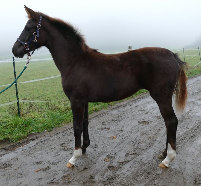Chocolate-colored filly from a top breeding farm, with her grandmother being a full sister to Dancier. The full brother of this foal placed 5th at the 2024 German Foal Championships. The mother is part of the Hann. Dressage Horse Program *, and another full brother of Fahrenheit has successfully competed with Bucha as a 6-year-old. Additionally, she has a sister to Sezuan, an elite mare and HvdD show champion. BEYONCE is a well-mannered, age-appropriate filly that is trusting and very attached to humans. She possesses a high level of quality, is regularly dewormed, handled by the blacksmith, well-fed, and in excellent condition. She is now ready to be weaned and can stay with us for further rearing. Current videos are gladly available upon request at 0171-4720209.