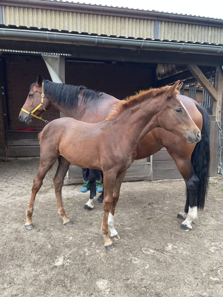 Zum Verkauf steht hier, preisgünstig wegen krankheitsbedingter Zuchtaufgabe, ein Stutfohlen von Vidar (Viscount-Edward-Contendeo I / Landgestüt Celle) aus einer Hannoveraner Prämienstute von Floriscount - Caprimond - Diplomat - Wohlklang, geboren am 19.05.2025. Wird definitiv Dunkelfuchs. Mit einem wunderschönen Gesicht ausgestattet, weiß sie sich ab Tag 1 sowohl charakterlich als auch bewegungstechnisch in Szene zu setzen. Vollbruder vom Vorjahr kann vor Ort besichtigt werden und steht bei gutem Angebot ggf. Auch zum Verkauf. Videos können bei ernsthaftem Interesse auf Anfrage zugesandt werden. Standort: 29476 Gusborn