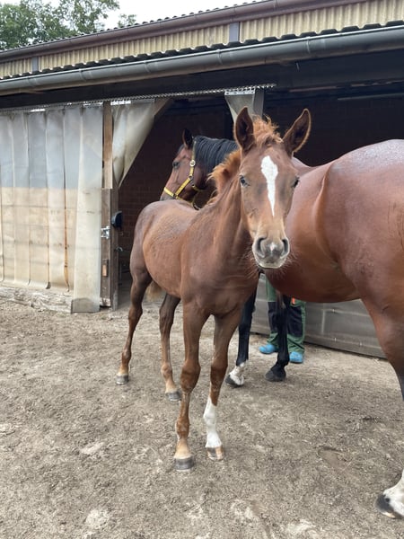 For sale here is an affordable filly due to a breeding career ending caused by health reasons. She is sired by Vidar (Viscount-Edward-Contendeo I / Landgestüt Celle) and comes from a premium Hanoverian mare by Floriscount - Caprimond - Diplomat - Wohlklang, born on May 19, 2025. She will definitely be a dark chestnut. With a beautiful head, she has been able to showcase her character and movement qualities right from day one. Full brother from the previous year can be viewed on-site and may also be available for purchase if the offer is suitable. Videos can be sent upon request for serious inquiries. Location: 29476 Gusborn