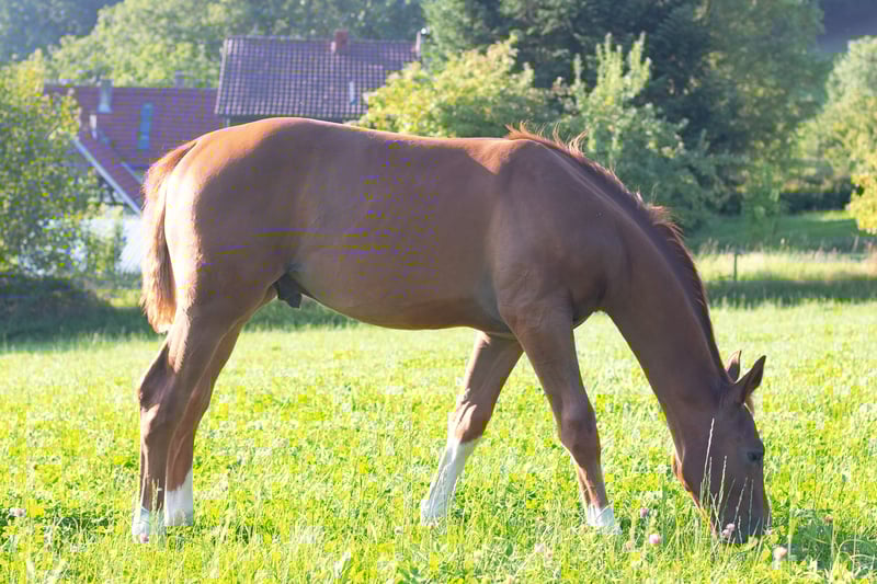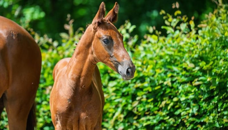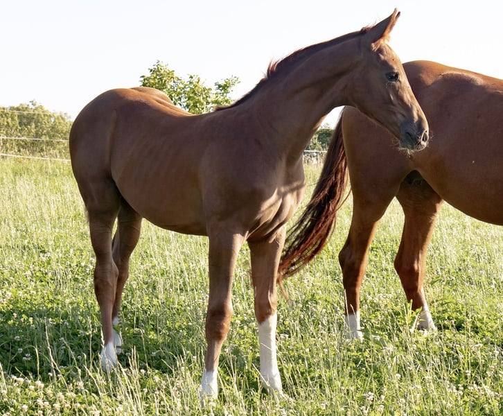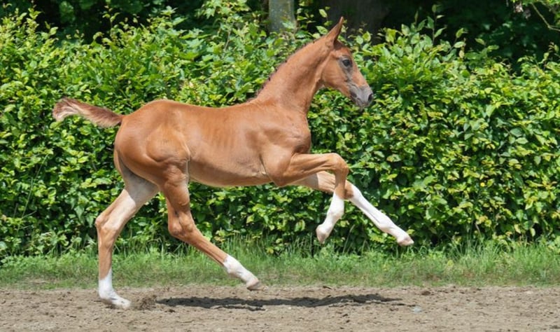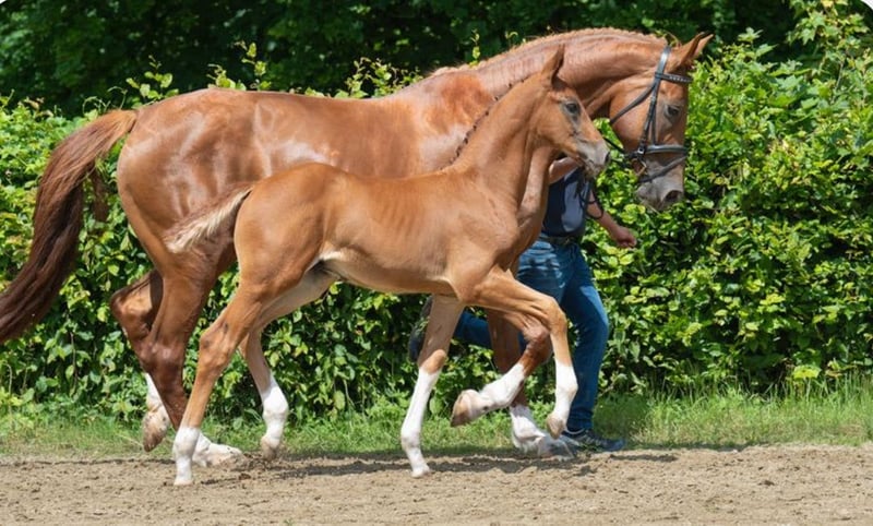 Typical colt with proven lineage and a modern appearance. This charming and athletic dark chestnut with four white legs was born on April 4, 2025, and combines everything that makes a dressage rider's heart race in his pedigree. Fidertanz represents the modern dressage horse like few others: noble in type, clear in temperament, and high-class in movement. His offspring shine with above-average rideability, work ethic, and mental strength – often proven up to Grand Prix level. Maternal line: Rotspon – Belstaff – Ferro The maternal line of this foal guarantees balanced, performance-oriented riding horses with the best character: • Rotspon, a son of the legendary Rubinstein, is known for his particularly rideable and easily trainable offspring with a lot of heart, nerve strength, and excellent temperament. • Belstaff (by Brentano II) brings elegance and carrying power to the line – qualities that not only impress visually but also make a difference in riding. • Ferro, one of the most significant stallions in Dutch dressage breeding, adds expression, energy, and athletic toughness to the pedigree, always paired with a clear mind and willingness to perform. This pairing promises a highly rideable, reliable, and character-strong riding horse – with exactly the attitude that is so sought after in today’s dressage sport. A full brother of this foal is currently in stallion breeding, which speaks for the type, movement, and temperament of the pairing. A foal for the future – with a clear mind, great character, excellent lineage, and extraordinary development potential. Perfect for sport, breeding, or ambitious riders looking for a reliable dressage horse of tomorrow. We look forward to your inquiry.