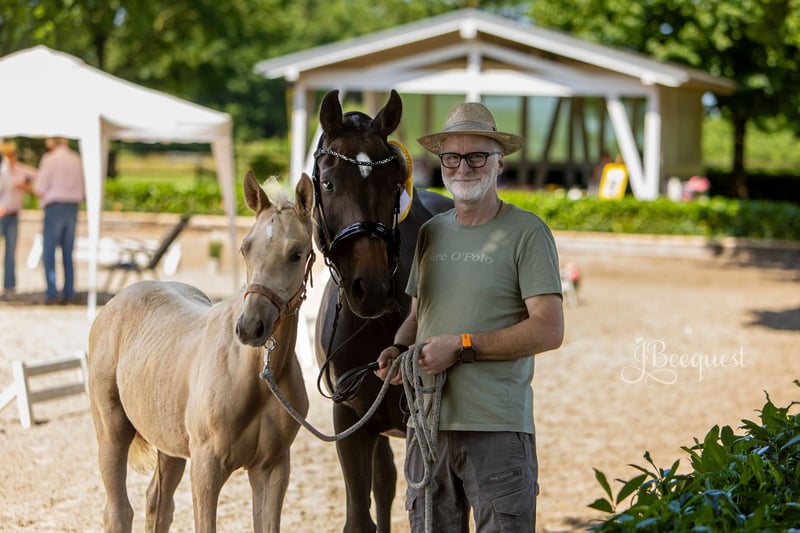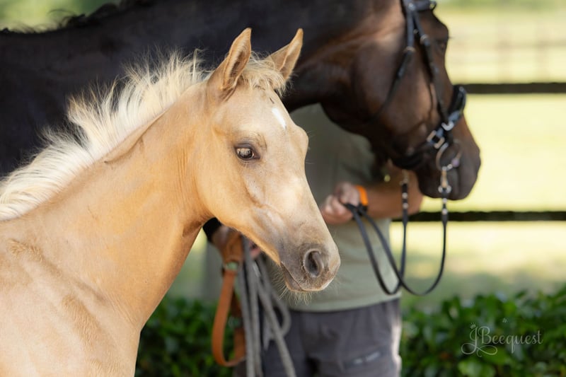 Quinario B Qandide x Bonifatius x Londonderry We are offering our colt Quinario born this year for sale. He was born on March 25, 2025. Due to his sire, he is a very handsome light Palomino. He has very long legs, a lively canter, an outstanding trot, and a strong walk. At the foal show, he was awarded Reserve Champion for these qualities. Quinario is very independent and completely fearless. Traffic noise, hot air balloons flying low, fireworks, and music bands do not bother him. From his first week, we start training the foal’s basics, so all our foals are halter-trained, load easily, and are familiar with the blacksmith and veterinarian at the time of sale. They learn to recognize all daily sounds on the farm and are accustomed to dogs. Our mares with foals graze together on 2.5 hectares of pasture during summer, day and night. In autumn and winter, they are outside for 10-12 hours during the day with 24/7 hay and housed in large foaling stalls at night. This ensures the foals grow up very well and get used to all weather conditions and temperatures right from the start. He is the fifth foal of his dam. Beautiful Mind 8 is a very elegant, beautiful state premium candidate from the Juggema dam line. She is dark bay and approximately 168 cm tall. Her first foal, a black stallion by Goldberg, was sold immediately after birth. Her second foal, a black stallion by Despacito, was sold at the Hannoveraner Elite Auction to Spain. Her third foal, by Franziskus, was awarded and is currently in training with his rider. You can follow him on Instagram. Her fourth foal, Felisa, is with us and can be visited. Beauty is incredibly affectionate and gentle, consistently passing on this intelligent and lovely temperament to her foals. Like all our mares, Beauty has been tested and is WFFS negative. Dam line: Grafitti v. Graf Top (DRE: S** success with Elisabeth Beneke-Backhaus); Saphir v. Sunlight xx (VS: international CIC*** success with Gerd-Olaf Neuberg); Dorian Gray v. Don Picardi (VA 2009: €47,000, DRE: S* success with Katrin Alkenings); Licensed stallion Desperados FRH v. De Niro (VA 2003: €104,000, individual bronze and team gold at the 2016 Olympic Dressage, ridden by Kristina Bröring-Sprehe); Don Diego v. Don Frederico (VA 2007, DRE: international GP success, bronze medal at the U25 European Championships 2016 with Juan Pablo Matute Guimon); Licensed stallion Don Noblesse v. Dancier (DRE: international GP success with Susan Pape); Weneziano v. Wolkenstein II (DRE: international GP success with Martina Steisslinger); Acrobat v. Acord II (SPR: success at 1.40 m show jumping with Philipp Ulrich). The sire, Qandide, is a handsome Cremello stallion who passes his calm, composed nature to his foals. We previously had a foal from him out of a different mare and can clearly see the similarities. Both are very similar in their relaxed, unshakable demeanor. Qandide is free from ECVM and WFFS. More information about him can be found at https://www.hengste-rohmann.de/qandide We prioritize good upbringing and transparency, so you can follow our breeding progress daily on Instagram. Of course, Qandide can also be visited and viewed at our farm. A current video of him in motion can be made and sent upon request. The last photos show his dam and previous offspring. He is still with us but will soon move to a top-class upbringing facility. The stall space can be taken over if desired. If interested or if you have any questions, please contact us via message, WhatsApp, or phone. Phone: +49 152 53765924