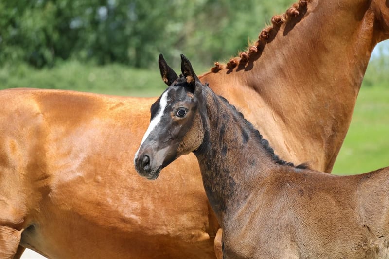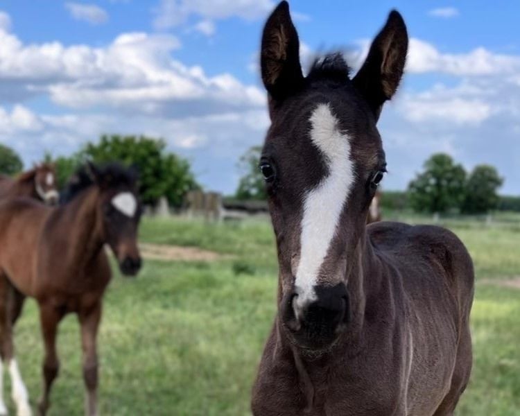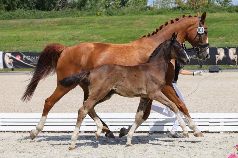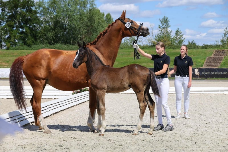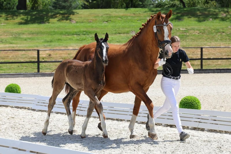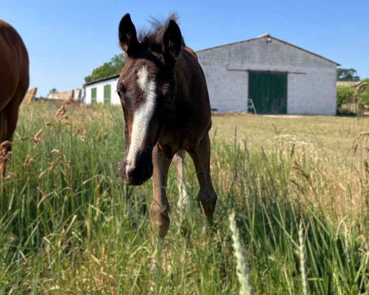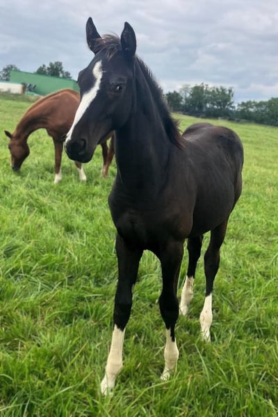 Colorful black stallion with four white socks! This stunning, modern foal by St. Emilion boasts three elastic, powerful basic gaits with plenty of push from the hindquarters. In terms of character, the stallion is very sweet, affectionate, and people-oriented. He is always well-behaved in handling. This outstanding foal offers the best prospects for both dressage and leisure riding and is particularly interesting for high-level competition sport. The young stallion is regularly handled on a lead, familiar with basic foal training, and in top condition. He is regularly trimmed by the farrier, dewormed, chipped, and in excellent health. Bred from loving and caring private breeding. We are happy to show you this magnificent foal in person! Viewing can be arranged immediately. Feel free to contact us via WhatsApp as well: +49 176 55323449. His sire is the premium stallion St. Emilion (Klosterhof Medingen), from the Rubin-Royal line. He scored top marks in the licensing test (8.62) and performance test (8.59), was Vice-Champion of Oldenburg and nominated for the Bundeschampionat. His offspring impress with elegance, rhythm, and impulsion. The dam is an extremely reliable competition horse with versatile talent. She has competed in dressage and eventing, and has also been successful in show jumping up to class L. As a valuable daughter of the popular and very rideable Royal Blend (Landgestüt Celle), she boasts a strong pedigree. We hope and expect her wonderful attitude and mindset to be passed on to this promising foal! Excellent, highly versatile performance bloodlines: Close relatives include among others Dissertation FRH, Grundstein I+II, and Carbid. Hanoverian mare line of Kandare: The approved stallions include: Adieu Z (by Alme Z), Aladin Z (by Alme Z), Apple Juice (by Tresor D'opaline, 1.60m jumping), Armicornit H (by Armitage, 1.40m jumping), Carbid (by Calypso II), Chaccogranulito (by Chaccato, 1.40m jumping), Cornet's Crown 2 (by Cornet's Prinz, 1.50m jumping), Decanto (by De Niro, PSG/Inter I), Drombusch (by Don Vino), Ehrengold MJ (by Ehrentusch, dressage Grand Prix), Elzas (by Diamant De Semilly, 1.65m jumping), Empire (by Calvaro Z, 1.60m jumping), Espen R (by Escudo I), Fex (by Feinkorn), Flavio (by Cicero Z Van Paemel, 1.55m jumping), Glücksbringer (by Granulit, 1.30m jumping, 0.90m eventing), Goldberg (by Gotthard), Grundstein I (by Graphit, dressage Grand Prix), Grundstein II (by Graphit, 1.20m jumping, L*-level dressage), Ice Tea (by Tresor D'Opaline, 1.45m jumping), Like Look (by Likoto xx), Raikano's Son (by Raikano, PSG/Inter I), Ramiro As (by Ramiro Z), Sir Casey (by Singular Joter I, 1.20m jumping). The sport horses include: Acaja (by Numero Uno, 1.50m jumping), Acciaccatura (by Archipel, PSG/Inter I, performance mare), Amelie 85 (by Chico's Boy, 1.45m jumping), Barones II (by Concorde, CCI3*), Cadoc Z (by Carthago, CCI4*), Calistero (by Cascadello I, 1.45m jumping), Carisma (by Calypso II, 1.20m jumping, L-level dressage), Captain Tiger Tilly (by Grey Top, CCI4*), Cassandro (by Calypso II, M*-level dressage), C'est La Vie 94 (by Cloney, 1.20m jumping, CCI3*), Chattanooga (by Cornet's Prinz, 1.60m jumping), Chalypsa (by Chacco-blue, 1.55m jumping), Chalypso (by Chacco-blue, 1.50m jumping), Chicago Z (by Caretano Z, 1.60m jumping), Chico II (by Cador, 1.55m jumping), Conchado (by Conthargos, 1.55m jumping), Conquest (by Cheenook, 1.60m jumping), Diana (by Don Primero, M**-level dressage), Dissertation FRH (by Don Crusador, dressage Grand Prix), Duke 276 (by Don Crusador, M*-level dressage), Fame 240 (by Floriscount, PSG/Inter I), For Luck (by For Keeps, 1.50m jumping), Furiso Z (by For Pleasure, 1.45m jumping), Galanth (by Graphit, S-level dressage), Geronimo 713 (by Grey Top, 1.50m jumping), Gigi Top 2 (by Grey Top, 1.45m jumping), IB Chica (by Cador, 1.60m jumping), Il Capriccio (by Itaxerxes, 1.30m jumping, L*-level dressage), Jacques Chirac (by Weltmeyer, M*-dressage), Just Have Faith TN (by Glock's London, CCI3*), Levinjo 5 (by Likoto xx, 1.15m jumping, L*-level dressage), Lindstroehm H (by Locksley II, dressage Grand Prix), Lohengrin 87 (by Londonderry, M**-level dressage), Lotta M (by Likoto xx, 1.10m jumping, L*-level dressage, 1.00m eventing), O Come On M (by Come On, 1.60m jumping), Olymp (by Libero H, 1.60m jumping), Pheton M (by Come On, 1.50m jumping), Quite Dynamite (by Quality, 1.40m jumping, L*-level dressage), Rittus (by Littus R, CCI1*), Sam (by Spartacus TN, 1.45m jumping), Sally 643 (by Salito, 1.55m jumping), Sciara HS (by Salito, 1.45m jumping), Sirius (by Silvio I, 1.60m jumping), Steingold 2 (by Steinpilz xx, 1.20m jumping, L**-dressage), Stormreaver FP (by Calato, 1.45m jumping), Van Der Vaart R (by Van Helsing, 1.50m jumping), Wattenkieker 2 (by Wolkentanz I, 1.20m jumping, A-level dressage), Wendel (by Flamenco De Semilly, 1.45m jumping), White Shot (by Singapore, 1.45m jumping), Wienu M (by Weltmeyer, PSG/Inter I), Winergy 22 (by Weltmeyer, M**-dressage).