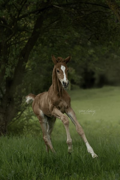 Sky-Dweller is a charming colt, born on April 26, 2025, who captivates with his charm and potential. In the photos, he is just 5 days old. He presents himself in a beautiful chestnut color that will develop into an elegant dark chestnut over time. Particularly striking is the lovely blaze that gives him a unique appearance. At the foal show in Luhmühlen, this young talent was rated 8.5 for type and 7.5 for the rest. He handled all challenges with confidence, is well-behaved on the trailer, and is extremely sweet, cuddly, and friendly – just like his mother. The setting, the audience, and even the waiting on the trailer were no problem for the foal at all. The foal is growing up with his mother in a harmonious herd of five mares with offspring, providing him with a natural and social environment. About the dam line: Fajana is a dark chestnut mare born in 2011, by Fürst Nymphenburg × Liseth (by Londonderry). She is a state premium mare bred by Hans-Henning von der Decken. In 2014, she completed her performance test. Her very good basic gaits are lively and expressive. Riding score by judge: 8.0 Riding score by external rider: 9.5 She has won dressage tests at the A level. Height: 168 cm In the pictures, the colt is 5 days old. One photo is from the foal show on June 13, 2025, in Luhmühlen.