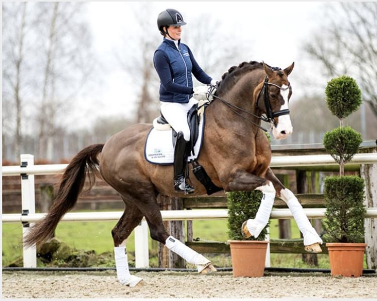 Bugatti est un poulain issu d’une remarquable lignée de dressage Hanoverienne. Bai avec de magnifiques marques blanches : trois chaussettes très hautes et un masque blanc, il est spectaculaire à chaque mouvement. Extrêmement bien construit, avec de belles proportions et des membres postérieurs actifs, il laisse déjà présager qu’il deviendra un compagnon de sport exceptionnel. Le père de Bugatti, Benicio, est un excellent exemple de ce à quoi doit ressembler un étalon Hanoverien. Lors de ses 30 jours d’évaluation à Schlieckau, il a obtenu la note maximale de 10,0 à dix reprises. Sa note finale pondérée de 9,14 lui a assuré une victoire claire. Sa valeur de reproduction HLP pour le dressage s’élevait à 167. La mère de Bugatti est une jument noire, moderne et d’un style extrêmement élégant, issue de la race Westphallienne, nommée Finschen.