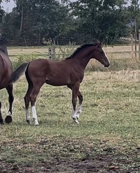 À vendre, un étalon au marquage frappant, fils de Nasdaq Z x Cornet Obolensky x Ukato x Nabab de Reve, né le 01.05.2025. Le père, Nasdaq Z, est issu de l'étalon de Grand Prix 5* Nixon van 't Meulenhof, le frère de l'étalon olympique Emerald, et d'une jument par Casall et l'influente étalon de sang pur Heraldik xx. Construit de manière correcte avec une grande foulée, le poulain étalon se montre très attentif et confiant, un futur combattant pour le parcours de saut d'obstacles. Il est manipulé au licol, présenté régulièrement au maréchal-ferrant et vermifugé. Directement du producteur. D'autres photos ainsi que des vidéos peuvent être envoyées par WhatsApp. Pour toute demande, veuillez contacter le 017663298629.