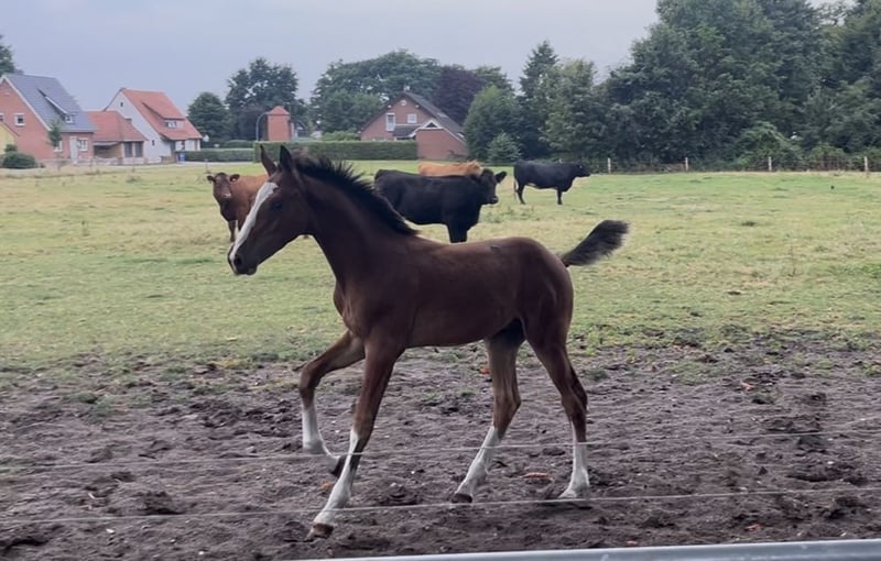 Zum Verkauf steht ein auffallend gezeichneter Hengst von Nasdaq Z x Cornet Obolensky x Ukato x Nabab de Reve, geboren 01.05.2025. Vater Nasdaq Z ist abstammend vom 5*-Grand-Prix-Hengst Nixon van 't Meulenhof, dem Bruder des olympischen Hengstes Emerald, und von einer Stute von Casall und dem einflussreichen Vollbluthengst Heraldik xx. Korrekt gebaut mit großer Galoppade zeigt sich das Hengstfohlen sehr aufmerksam und selbstbewusst, ein zukünftiger Kämpfer für den Springparcour. Er ist halfterführig, wird regelmäßig beim Hufschmied vorgestellt sowie entwurmt. Direkt vom Züchter. Weitere Fotos sowie Videos können gerne per WhatsApp verschickt werden. Anfragen an Tel. 017663298629