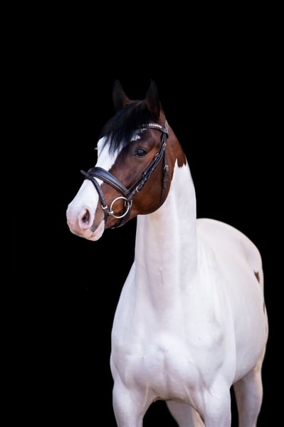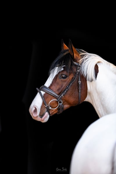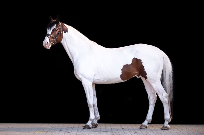 Mescalino is a five-year-old Pinto stallion who impresses equally with his performance, conformation, and temperament. He was awarded premium status as a foal and later became the breed champion at the State Championships in Bad Segeberg. At his licensing with the Mecklenburg Verband, he also impressed with above-average show jumping quality (score 8.5). He completed his stallion performance test at the age of three with an overall score of 7.88 and was recognized as a performance stallion. His friendliness, high willingness to learn and perform, as well as his exceptional rideability (scores up to 9.0), were particularly highlighted. His basic gaits were rated up to 8.0. Already at four years old, Mescalino achieved placings in young horse jumping competitions. Targeted further athletic development is planned for the 2026 competition season. **Pedigree:** Sire: Elite and performance stallion Mescalero, by Mangold N – Sando Paso N – Bajar, from Schleswig-Holstein’s most successful Pinto dam line. Mescalero has sired several licensed stallions, champion mares, champion foals, and successful sport horses up to M level. Among his recent breeding successes is the 2024 State Championess Sölrings Tami, bred from a Holsteiner mare. Dam: Calabria (by Consens – Cassini I), a Holsteiner district premium mare, herself successful in show jumping up to S level and awarded as a performance mare. The direct maternal line has produced numerous sport horses up to S level as well as licensed stallions such as Cocosinni, Light Up E, and Vaquero E. **Breeding Use:** Mescalino is ideally suited for German riding pony and warmblood breeding. He combines proven performance genetics, good basic gaits, strong jumping ability, and a balanced, willing character. He offers excellent prerequisites for sport-oriented breeding—paired with desirable coat color inheritance. His first foals are expected in spring 2026. **Approval:** Mecklenburg Verband German Horse Breeding Association Schleswig-Holstein Horse Studbook (Other associations on request) **Studbook:** HB I Pinto, Small German Riding Horse & German Riding Pony