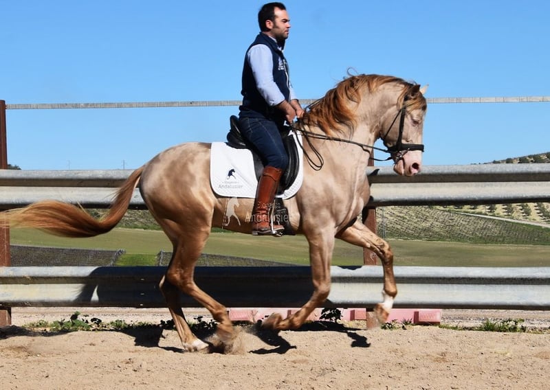 PRE stallone da allevamento di colore speciale, Bayo Perla (CrPrl), carattere gentile con temperamento piacevole, curioso, attento, affettuoso, giocoso, montato nelle andature di base, approvato, stallone da riproduzione da febbraio 2024, ha già dato alla luce diversi puledri, 1 stallone, 6 fattrici, altezza attuale 1,63 m, barocco, belle movenze, un mix tra spagnolo e dressage. Ha buone radiografie ed è negativo alla piroplasmosi, tassa di monta 500 €, si trova nella provincia di Cordoba (Spagna).