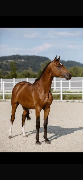 I purchased a 2-year-old Holsteiner stallion from Olaf Rörden (Föhr Island). He is now 10 years old, gelded, stunningly beautiful, very well-trained, and easy to ride on rubber bit (S-level dressage). He has passed one veterinary inspection and has never needed a vet. His pedigree is quite exceptional: direct descent from Baloubet du Rouet x Diamant de Semilly. He is a consistent winner up to 1.30 m, placed at 1.40 m, cautious, and above all, very easy to ride!