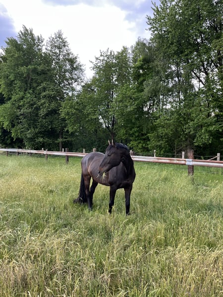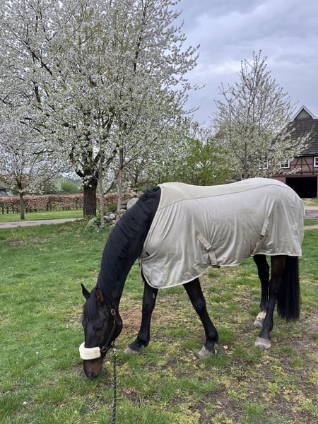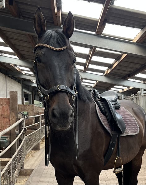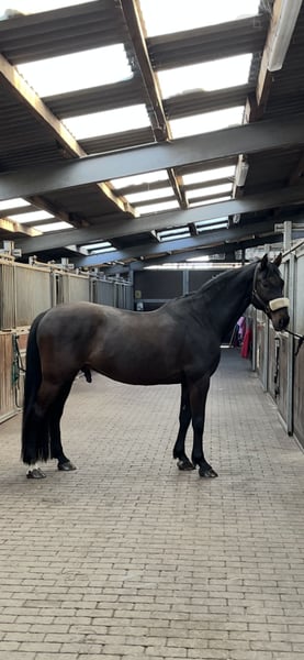 Zum Verkauf steht mein Holsteinerwallach namens Chandos 4. Er ist 2011 geboren und stammt von Cormint ab. Er ist springgezogen und hat viel Spaß bei der Cavalettiarbeit sowie kleineren Sprüngen. Das Springen wurde die letzten Jahre nicht weiter gefördert, macht ihm aber immer noch Spaß. Zudem ist er bis M-Dressur ausgebildet. Auch für Bodenarbeit ist er sehr zu begeistern. Wer ein gehobenes Freizeitpferd mit sehr schönen, ausdrucksstarken Gängen zum Dressur-Lektionen reiten sucht wird mit ihm glücklich werden. Im täglichen Umgang ist er sehr brav, braucht aber einen Reiter der ihm trotzdem viel Sicherheit gibt und klar kommuniziert. Daher wird er nicht als Anfängerpferd verkauft. Alleine fehlt ihm im Gelände die nötige Sicherheit, daher sollte man draußen mit ihm am besten in einer Gruppe unterwegs sein. Beim Verladen und Hängerfahren ist er routiniert und unkompliziert. Er wurde regelmäßig dem Hufschmied, Zahnarzt sowie Pferdephysio vorgestellt und ist auch hier umgänglich. Die Zähne sind grade wieder frisch gemacht worden. Natürlich ist er gechipt, regelmäßig entwurmt und geimpft. In der gesamten Zeit in der er bei mir war hatte er keine ernsthaften Verletzungen oder Krankheiten. Aktuell steht er Tagsüber draußen und kommt nur über Nacht in die Box. Momentan steht er in einer gemischten Wallach/Stuten Herde und fühlt sich dort sehr wohl. Falls Sie noch Fragen haben oder Chandos persönlich kennenlernen möchten, können Sie mich gerne auf WhatsApp anschreiben unter folgender Nummer: 0157 81806897
