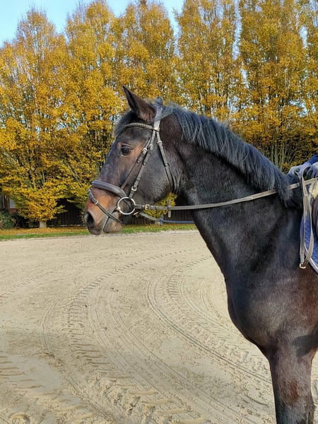 Zindo ist ein ausgesprochen lieber gelehriger Wallach. Wir haben ihn als Fohlen gekauft und er ist jetzt angeritten. Im Freispringen zeigt er von Mal zu Mal mehr Talent.