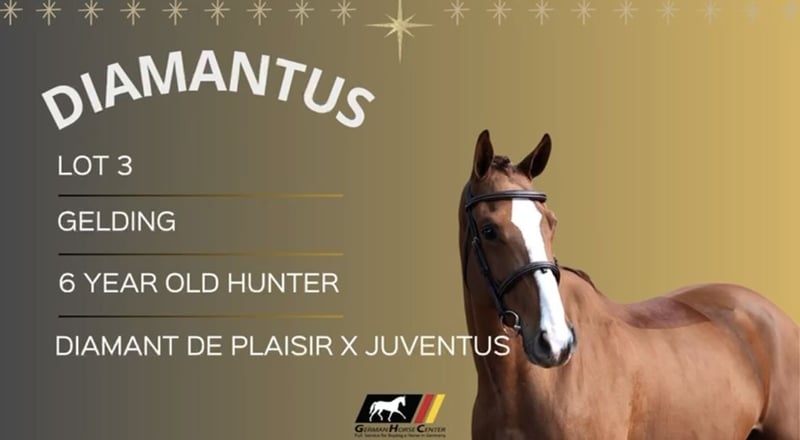 Il nostro gelding di 6 anni, figlio di Diamant de Plaisir × Juventus, è un vero e proprio talento emergente nel salto ostacoli, dotato di un’equilibratura impeccabile e di uno stile naturale e senza sforzo. “Diamantus” è coraggioso, gentile e assolutamente affascinante. Una vera bellezza, con un modo di muoversi naturalmente morbido e tutte le qualità necessarie per brillare nel ring dei hunter. Attualmente misura circa 16.2 hh ed è stato sottoposto a una visita veterinaria recente senza alcuna nota di rilievo.