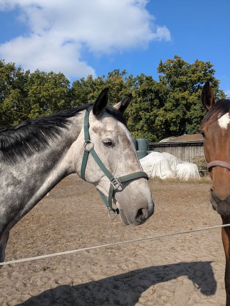 Verkaufen 7 jährigen Schimmelwallach. Beim Reiten und im Umgang ist er absolut artig. Er ist dressurmäßig gut zu reiten, springt einen A Parcours (war 2024 auch schon Gewöhnungsspringen platziert) und geht artig ins Gelände. Alleine ist er dort manchmal etwas ängstlich, aber kein Steigen oder buckeln. Claus steht in einer gemischten Gruppe und ist hier eher rangniedrig. Er hat von Geburt an einen blauen Fleck im Auge, der sich aber nicht vergrößert (siehe Bild ). Seine Sicht nach hinten ist eingeschränkt, nach vorne uneingeschränkt. Hiermit hat er aber keinerlei Probleme.