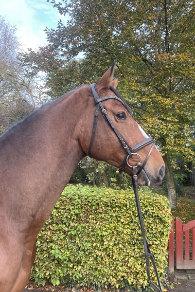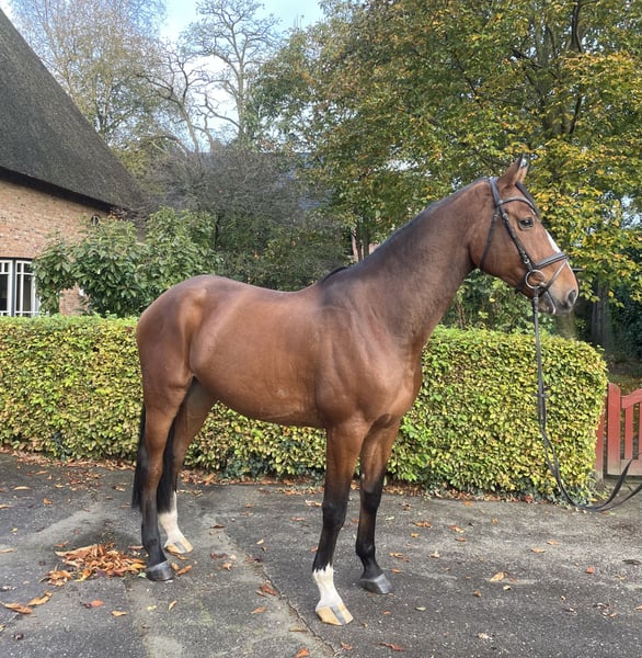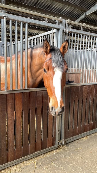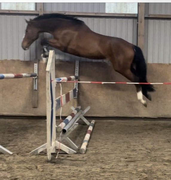 Gentle Giant Seeks a New Home! This 7-year-old gelding was born and carefully trained with us. Due to his size, he was only shown in competitions as a 6-year-old and has placements in Jumping Horse A and L classes. In daily work, he is straightforward yet sensitive, so he is not suitable for a complete beginner. X-rays available.