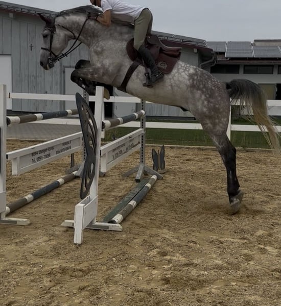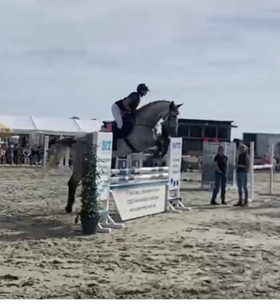Sport partner & heart horse in one For sale is a fantastic show jumping horse that impresses in the arena with great ability, overview, and ambition. Always jumps! In daily handling, he is absolutely well-behaved, people-oriented, and uncomplicated. A true amateur horse. ✨ Profile Age: 8 years Gender: Gelding Height: approx. 1.80 m Training level: currently at M level, potential for more ✨ What makes him so special In sport: honest, powerful jump with great overview and potential for higher classes In everyday life: affectionate, easy to handle, calm in the field Shoeing and loading friendly, always friendly in handling