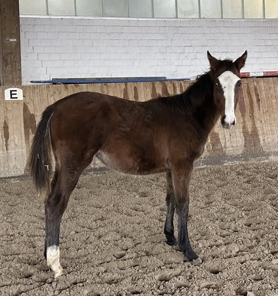 This modern, tall-legged filly is now available for sale. The attentive mare immediately catches the eye with her broad, white blaze. GK Theodora has excellent basic gaits and a very modern conformation. Thanks to her quality, she has all the prerequisites to develop into a successful sport horse in the future. Currently, the young lady is kept in a paddock with her three pasture friends in a loose box and is in excellent health. The filly is tall-legged, and her mother also possesses considerable size and stature (approximately 17.2 hh), so GK Theodora will also grow into a perfect riding horse size. Why is this good foal being sold at such an affordable price? In late October, my father unexpectedly passed away. As we are busy with three quite young children and both work full-time, managing a second farm (which I have now taken over) demands a workload that we cannot handle with just one employee. Therefore, we have decided to significantly reduce my father's horse herd, and this includes this foal as well. Please feel free to contact us with any questions – "final price inquiries" will remain unresponded. If you are genuinely interested in a very good foal, we invite you to arrange a visit. If everything fits, we can discuss a price afterwards. We look forward to hearing from you! www.gestuet-kriseby.de