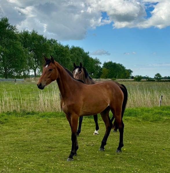 Aufgrund von Bestandsverkleinerung steht eine edle 2 jährige Stute aus familieneigener Zucht zum Verkauf. Die Stute stammt ab von dem belgischen Hengst Poker de Mariposa (Nabab de Reve x Berlin), der seit kurzem bei Willem Greve unter dem Sattel ist. Der Hengst konnte bereits in jungen Jahren bei den Weltmeisterschaften der Jungen Pferde auf sich aufmerksam machen. Selbst besticht die Stute durch ihre Leichtfüßigkeit, gepaart mit einem sehr modernen Erscheinungsbild. Zudem ist die Stute von kleinauf an sehr zugewandt und menschenbezogen. Bei weiteren Fragen gerne telefonisch melden unter: 0160-96436624