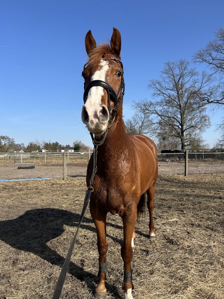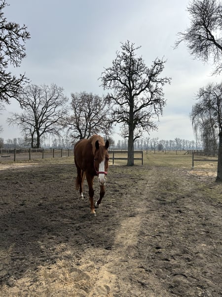 Das ist Ora sie ist eine Holsteiner Stute aus April 2021. Ora ist super lieb im Umgang. Sie lässt sich problemlos ohne Peitsche longieren, ist lieb beim putzen, sowie beim Tierarzt und Schmied. Sie zeigt dabei keine Unarten und ist verträglich mit anderen Pferden. Allerdings ist Sie dem Reiter gegenüber immer wieder skeptisch und unsere Gegebenheiten passen leider nicht zum Pferd. Generell steht sie super und fein an den Hilfen, lässt sich ohne Hilfsmittel reiten und ist lernwillig. Allerdings benötigt sie eine ruhige Umgebung für den Alltag. In ihrem Fall eine Halle, um ihr die nötige Sicherheit und Abschirmung von zu viel äußeren Reizen zu geben. Diese ist bei uns leider nicht gegeben, wodurch wir uns für einen Verkauf entscheiden müssen. Aufgrund Ihrer Skepsis dem Reiter gegenüber verfällt sie bei einem Schreck und zu vielen Reizen, wenn jemand drauf sitzt in Angst. An der Longe etc. ist dies allerdings kein Problem, da sie generell ein mutiges und neugieriges Pferd ist. Wir denken, dass dieses Problem in anderen Händen und Rahmenbedingungen gut händelbar und lösbar ist. Dann wird sie ein schöner Sport Partner sein mit dem man viel Spaß haben kann. Gelegentlich koppt sie. Bei uns haben wir das nur gesehen als Sie in der Box ein Leckerli bekommen hat. Beim normalen füttern ebenfalls nach dem Kraftfutter macht sie dies bei uns nicht. Bei Interesse rufen sie gerne +49 151 74521056 an.