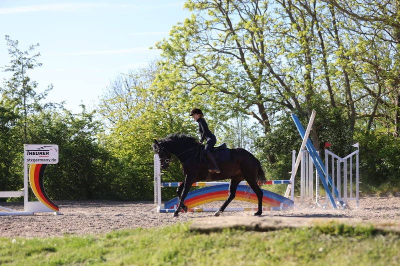 Frieda ist eine 6-jährige Stute von Chezarro aus einer Christo - Landgraf Mutter. Schonend 4-jährig angeritten ist Frieda in Springen und Dressur auf solidem A-Niveau. Leider bin ich gesundheitlich angeschlagen, weshalb sie immer wieder Pausen hatte und auch nur wenige Male auf Turnier vorgestellt wurde. Dies hat sie jedoch sehr artig gemacht und sie könnte sofort los. Friedas Passion ist eindeutig das Springen. Sie möchte mit gesundem Ehrgeiz immer auf die andere Seite, wird dabei aber nicht stark oder kopflos. Sie springt auf dicht oder auf weit. Verzeiht Reiterfehler und vermeidet eigene. Trotz begrenzter Erfahrung glänzt sie mit ausgesprochener Parcoursintelligenz und großem Mut. Guckig ist sie auch nicht. Unterbauten oder Wasser sind kein Thema. Dressur gehört nicht zu ihren Stärken, sie arbeitet zwar brav mit und ihre GGA sind vernünftig. Ein Lampentreter ist sie allerdings nicht. Außerdem fehlt es ihr bei der Dressurarbeit noch an Losgelassenheit. Es wird mit regelmäßiger Arbeit allerdings besser. Sie beherrscht die Grundlagen. Mit Seitengängen fangen wir gerade an. Im Umgang ist Frieda unkompliziert. Lässt sich gut verladen, kennt auch Auswärtstraining, benimmt sich beim Schmied & TA. Ausreiten waren wir noch nicht so viel. Am Strand zeigte sie sich aber entspannt und kopfklar. Lief brav durchs Wasser und sowohl hinten als auch vorweg. Sie steht nachts in der Box und tagsüber in einer gemischten Gruppe. Dort zeigt sie sich sehr sozial und unkompliziert. Artgerechte Haltung mit ausreichendem Auslauf und Sozialkontakten wünschen wir uns für sie auch zukünftig. Frieda ist ein absoluter Goldschatz und wird nur auf Grund meiner angeschlagenen Gesundheit verkauft. Allerdings ist sie erst 6 und damit nicht für Anfänger oder unsichere Reiter geeignet- Bisher war Frieda weder lahm noch verletzt. Eine AKU liegt jedoch nicht vor. Kann aber selbstverständlich gemacht werden. Weitere Videos können auf Anfrage versendet werden. Ein längeres Springvideo ist aus technischen Gründen nur als Link verfügbar: https://youtu.be/qbyYvZ-m9WY Probereiten ist selbstverständlich möglich.